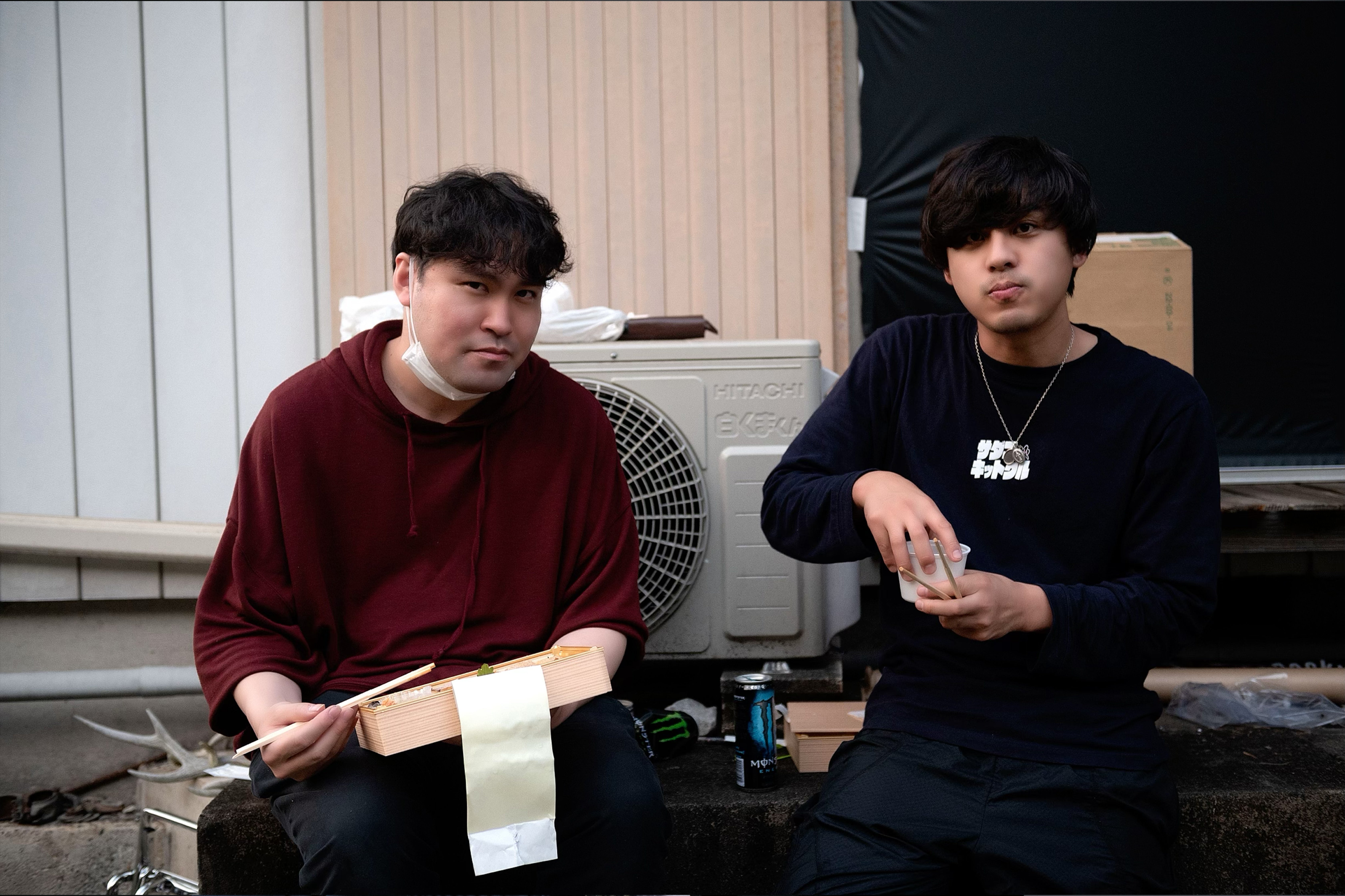 休憩中の筆者(左)と川又P(右)