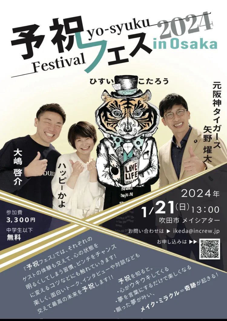 2023/08/17 20:00☆予祝祭りのお知らせです☆予祝祭来年の2024.1.21日曜日元阪神監督の矢野燿大さんひすいこたろうさん大嶋啓介さん礒田佳世4人でコラボ講演会をいたします!!https://www.kokuchpro.com/event/b00f241c9db3508446b68d6d293e416b/予祝とは祝福を予定すること。ステキなことです。予祝をし続けて、たくさんのご縁をいただいてからの3回目の予祝祭!この神回ができることも応援のおかげさまで、感謝しております。予祝を知って、お祭りのように楽しい一日を1000人で過ごしましょう!来年もHappyになること間違いないです。是非ともお越しいただいて、予祝体験をお楽しみください。#矢野燿大#大嶋啓介#ひすいこたろう#礒田佳世#ふんわり思好#2024.1.21#祭#予祝 もっと見る