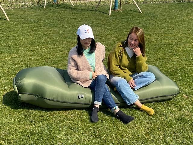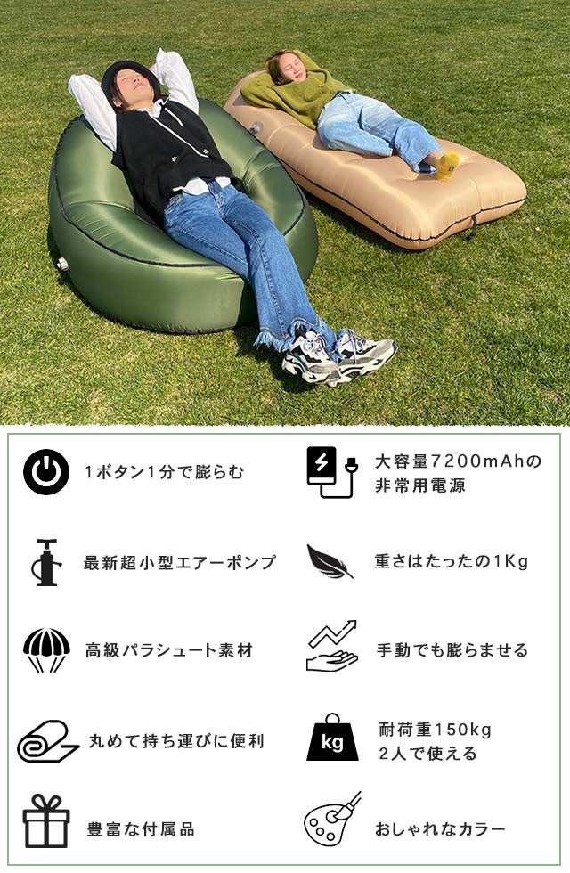 ボタン1つで自動で1分で膨らますことができる、パラシュート素材の超小型エアーポンプ内蔵、新エアーラウンジャー・エアーソファの新登場です。