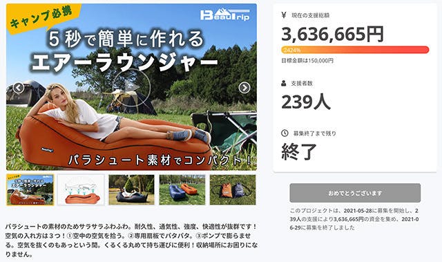 2022/09/18 14:01サポーター様3連休はどうお過ごしでしょうか?^^ BEAUTRIP Japanチームです。ご連絡が遅くなりまして大変すみません。無事に全ての製品を各サポーター様の方へ配送を完了いたしました!近日お手元に届くかと思いますので、リラックスした楽しい休日をBEAUTRIP自動エアーポンプ式エアーラウンジャー&エアーソファと過ごしていただけましたら幸いです^_^以上ですが、今後ともBEAUTRIPエアーラウンジャー&エアーソファを宜しくお願いいたします! もっと見るプロジェクト終了、感謝申し上げます!