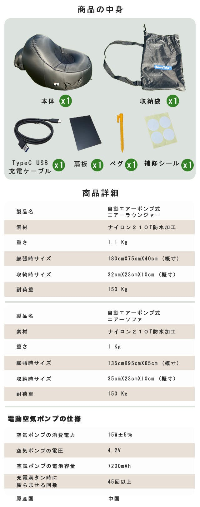 ・プロジェクトの属性:輸入商品 ・本商品の一押しポイント:電動エアーポンプ内蔵、パラシュート素材、屋内外用ポータブルなエアーベッド