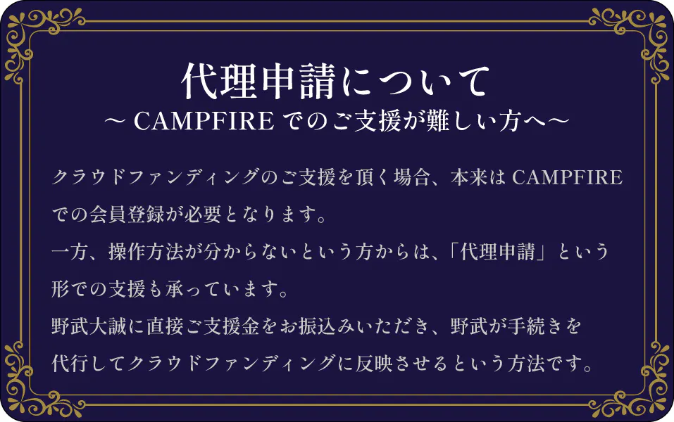 ※ご入金が確認でき次第、野武が代理でクラウドファンディングの決済手続きをさせていただきます。ご不明な点がございましたらお気軽にお問合せください。