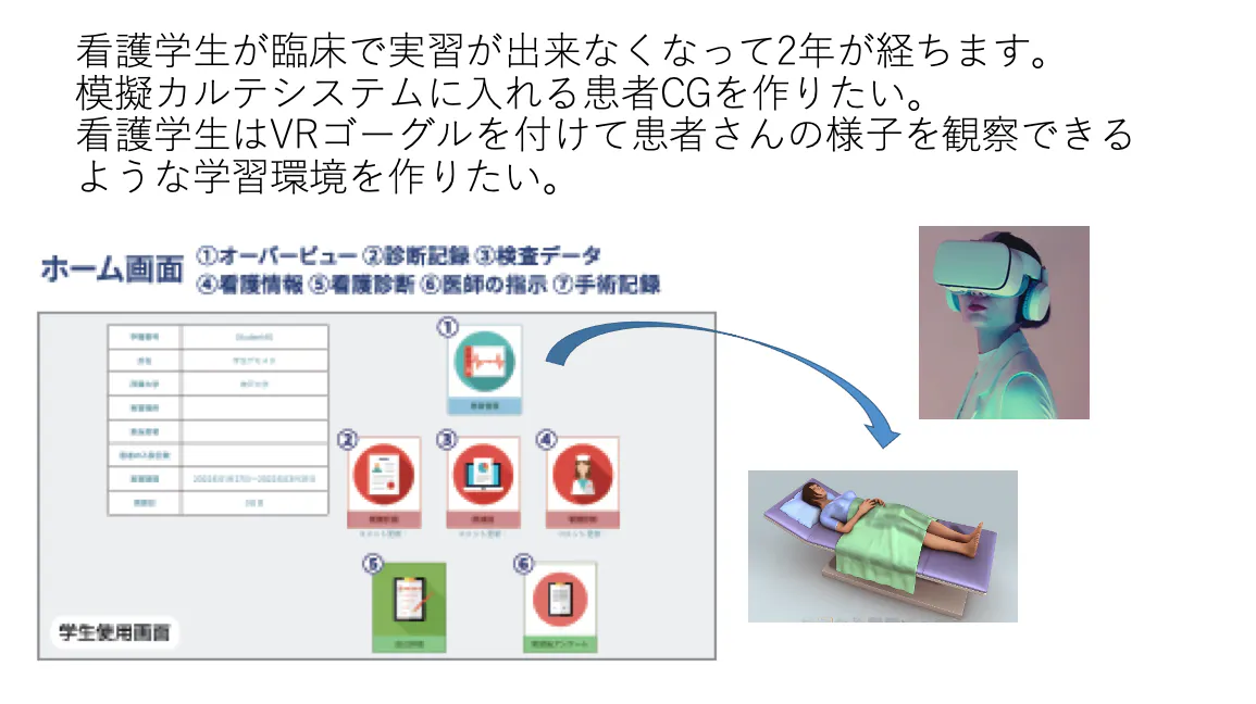 現場に行かなくても受けられる+リアルな研修体験の両方を叶えるために、看護学生と患者さんを繋ぐVR教材を作りたいと考えました。