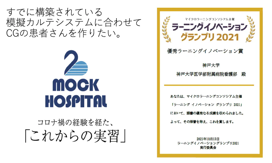 本教材は、神戸大学医学部附属病院看護部が2020年5月から開発に着手し、2020年6月から看護学生の実習指導として実装しています。指導実績は、2020年度は延べ1358人/日、2021年度は1127人/日あり、その間にシステム改善や患者事例のブラッシュアップを続けてきた素晴らしい教材です。この功績は、2021年マイクロラーニングコンソーシアム主催ラーニングイノベーショングランプリ2021において「優秀ラーニングイノベーション賞」を授賞しました。本教材は、コロナ禍で学生実習が困難な状況が続いている看護教育現場が待ちに待った教材です。