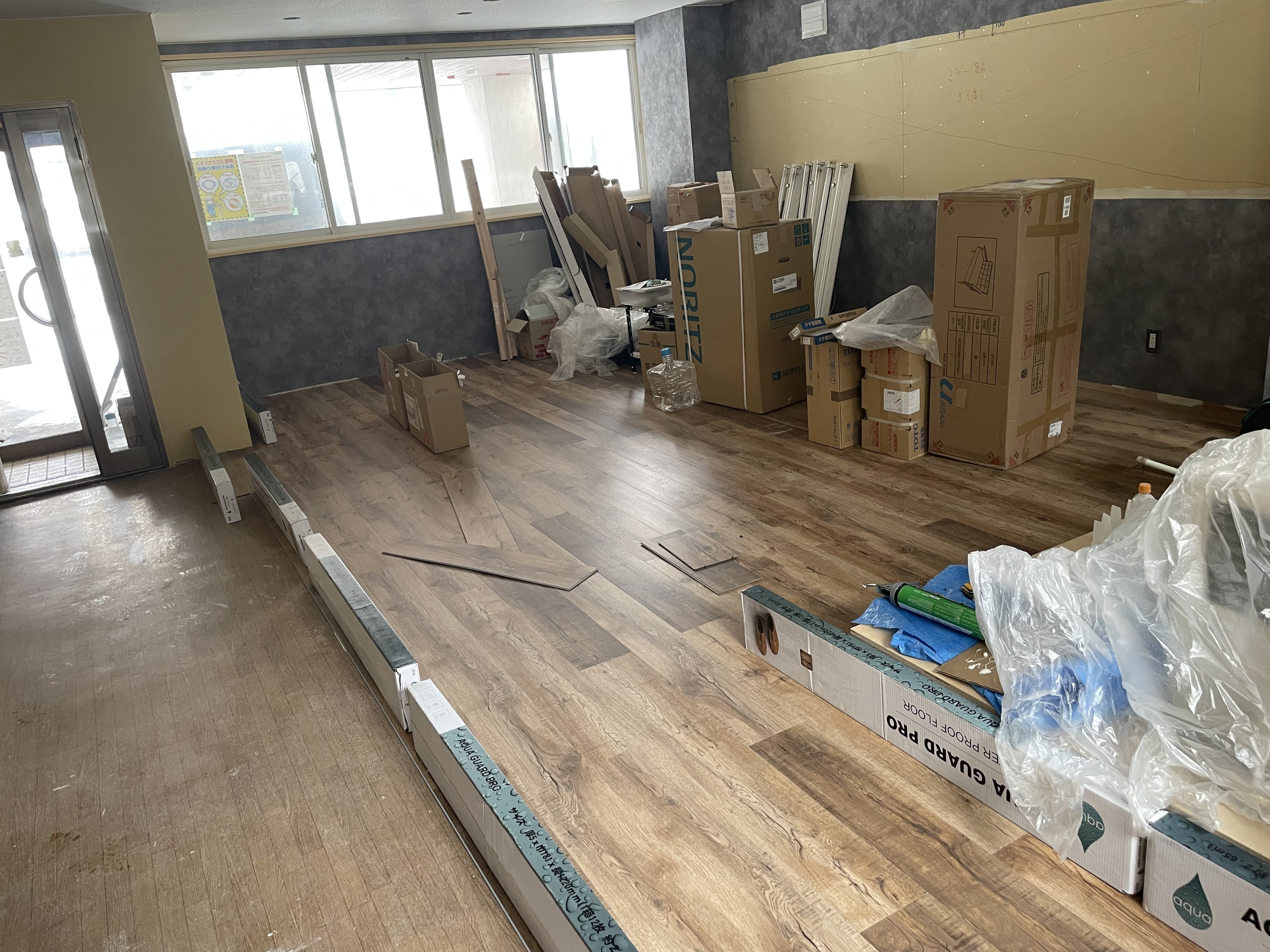 下写真は、自分で床材を貼ってるところです。