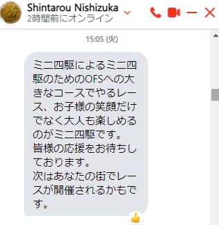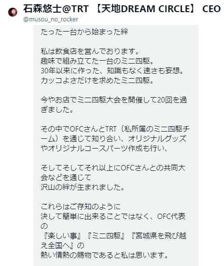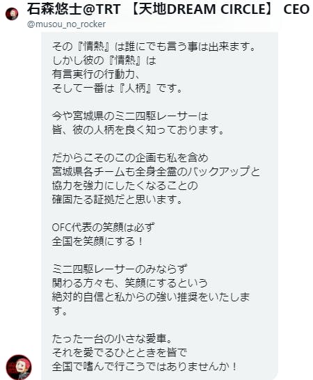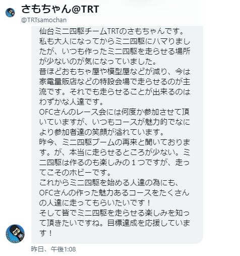 「世界を変える!」とか「街に活気を取りもどす!」とか大げさなことは言いません。ミニ四駆というホビーを通して身近な人を笑顔にできたら、きっとその隣りの人も笑顔にできる。そしてその連鎖がきっと世の中と日常をちょっとだけ楽しくできると信じています。