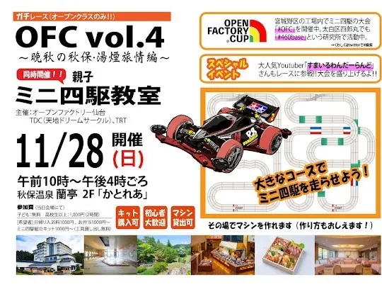 2021年12月7日のミヤギテレビ「OH!バンデス」内で11/28に開催されたオープンファクトリーカップin秋保温泉蘭亭の様子が放送されました!!ご覧いただいた方もいらっしゃると思いますが、オープンファクトリー仙台は「ミニ四駆でハッピーコミュニケーション」をテーマ(?)に日々楽しいことを追求してまいります!今後ともどうぞよろしくお願いいたします^-^)/