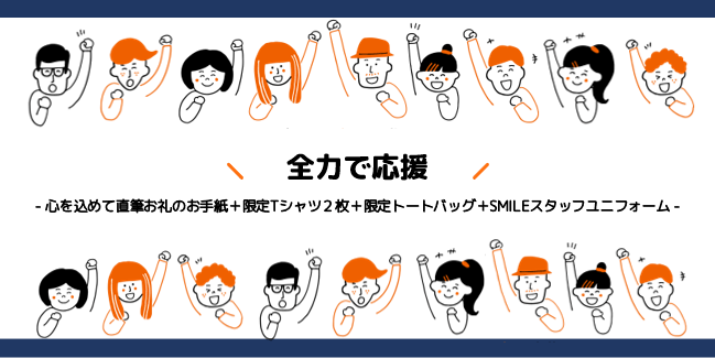 ・心を込めて直筆お礼のお手紙+限定オリジナルTシャツ2枚+オリジナルトートバッグ+スクール完成写真+SMILEスタッフ限定ユニフォーム