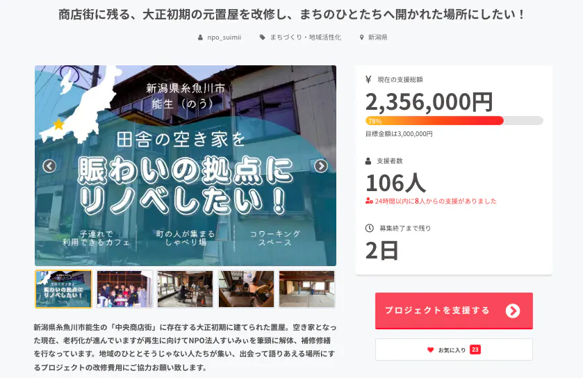 現時点で、2,356,000円のご支援をいただいております。