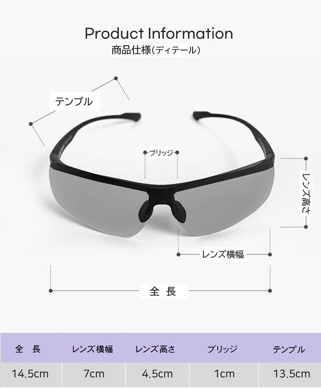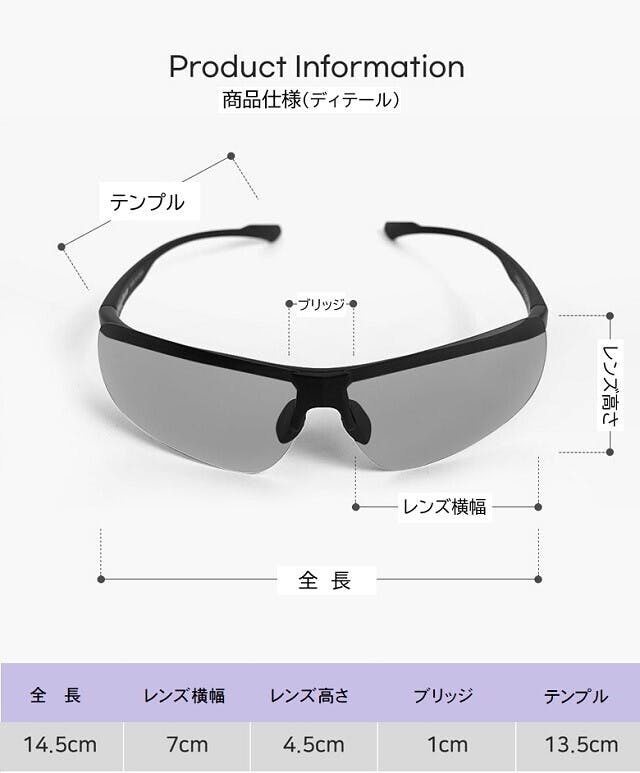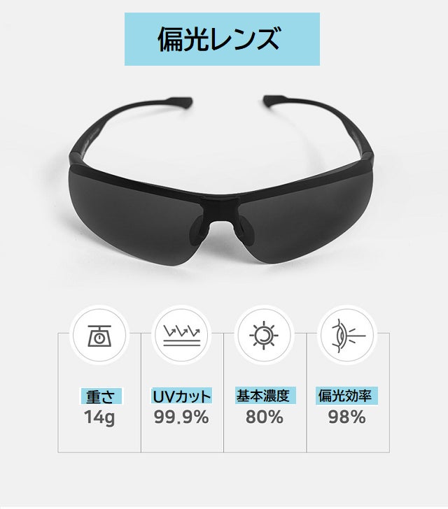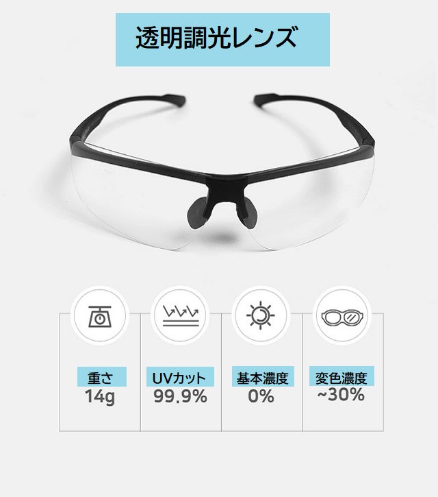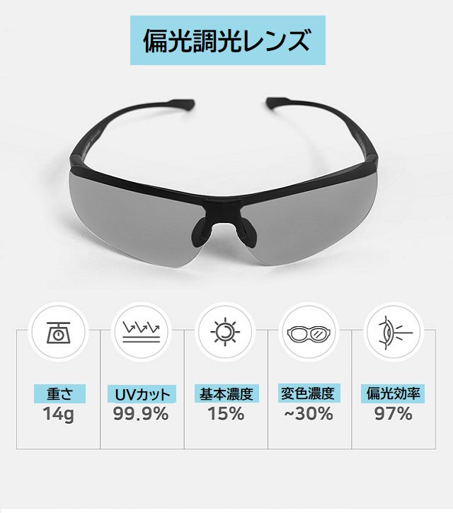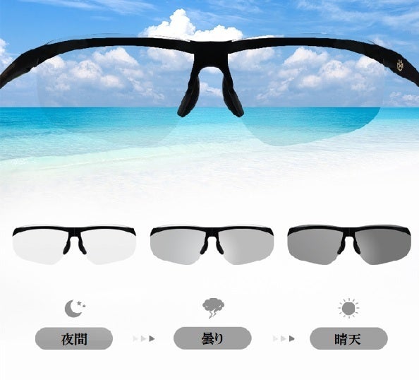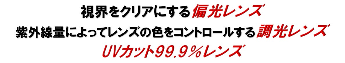 ギラつく光や 眩しい照り返しを抑え視界を見やすくする偏光レンズと 紫外線量の強い時にはレンズの濃度がさらに濃くなって曇りや紫外線の弱い時はレンズ濃度を薄く保って視界を調整する調光レンズと UVカット99.9%の3つの機能をドッキングしたサングラスです。