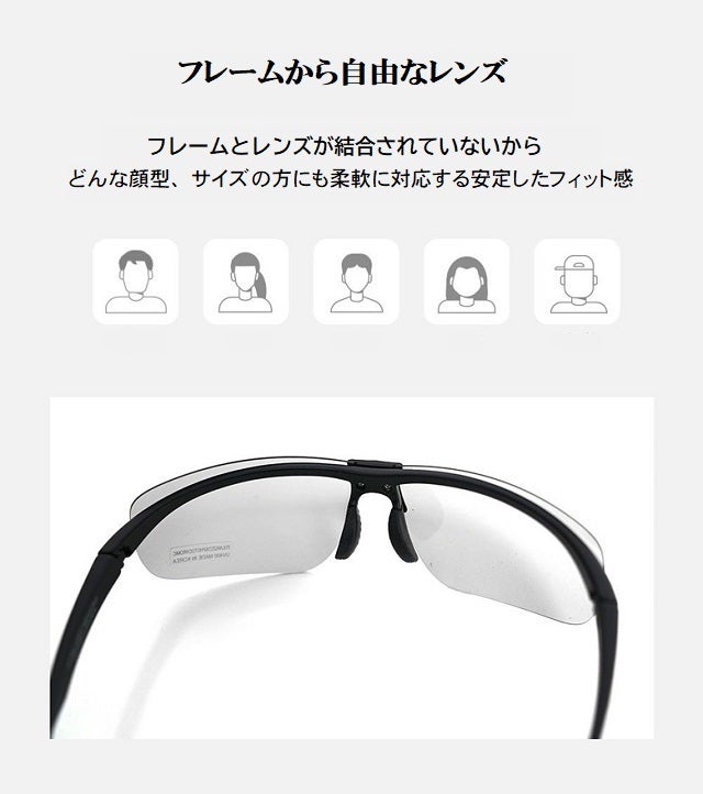 従来のサングラスはフレームとレンズが結合されていましたがChangeMasterは結合と補強がありません。補強に金属も使っていないのでしなやかな弾力性を保ってフィット感が抜群!フレームのカーブは どんな頭の大きさや形の方にも対応してフィットします。ブレない安定感で優しく包み込んでくれるのです。