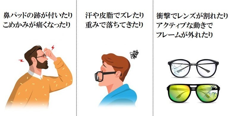 ・レンズとフレームが弱くて衝撃で折れたり割れたり