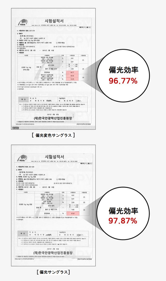A.変色は紫外線指数に反応しますが、試験成績書の試験時にはuv400紫外線指数100パーセントの条件で試験を行うため、変色率が高いです。日常の天候の紫外線指数では、テストのように変色率を出すことはできません。日常で使用する際の変色率は紫外線指数に応じて0~30%程度で見れば良いようです。