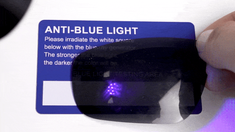↑透明調光サングラスにUV400ライトを当て変色するテスト過程です