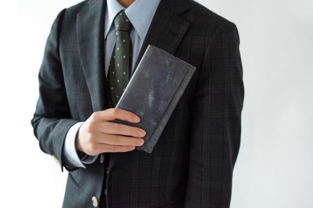 スリムでコンパクトな風琴財布は内ポケットなど省スペースにスムーズに収納できるのでビジネススーツにもよく合います。