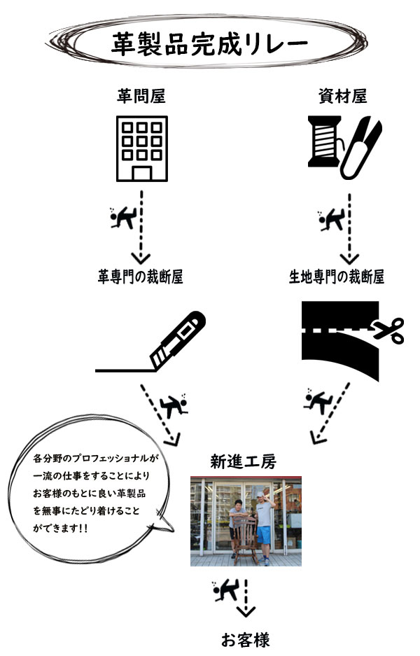 革製品の修理の流れは先ほどと逆の流れになるので修理までに時間がかかり、間に多くの人が介在するので無料で修理を受けていないところが多いのが実状です。新進工房はお客様との間に人が介在しないので通常の流れに比べて修理の時間が短くできます。無料でお受けするのは簡単なことではございませんが、一生懸命作った革製品を長く気持ちよく使っていただきたいとの一心で新進工房では、無料で修理を受けさせていただいております!保証内容につきましてご不明点などございましたらお気軽にご連絡くださいませ。