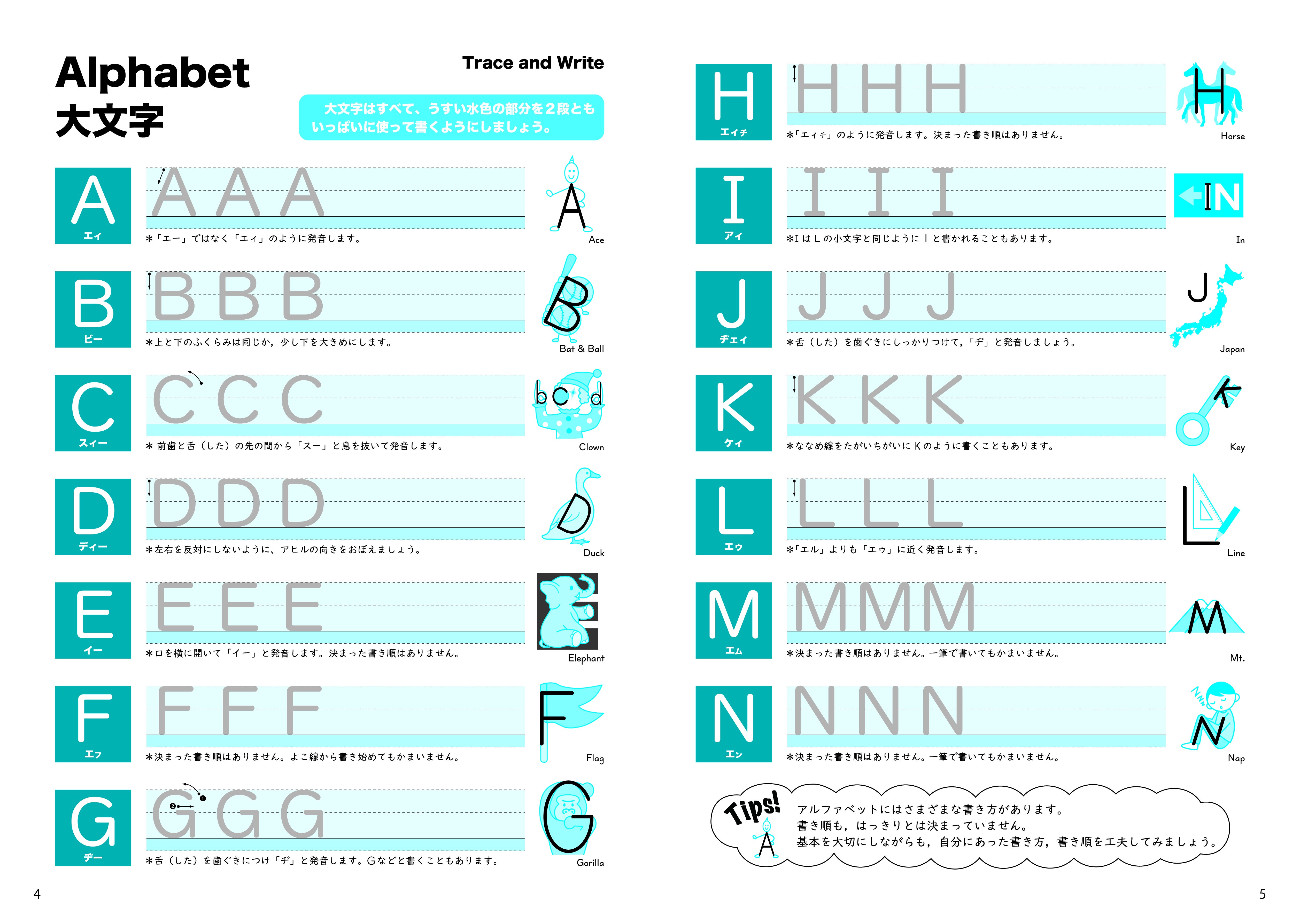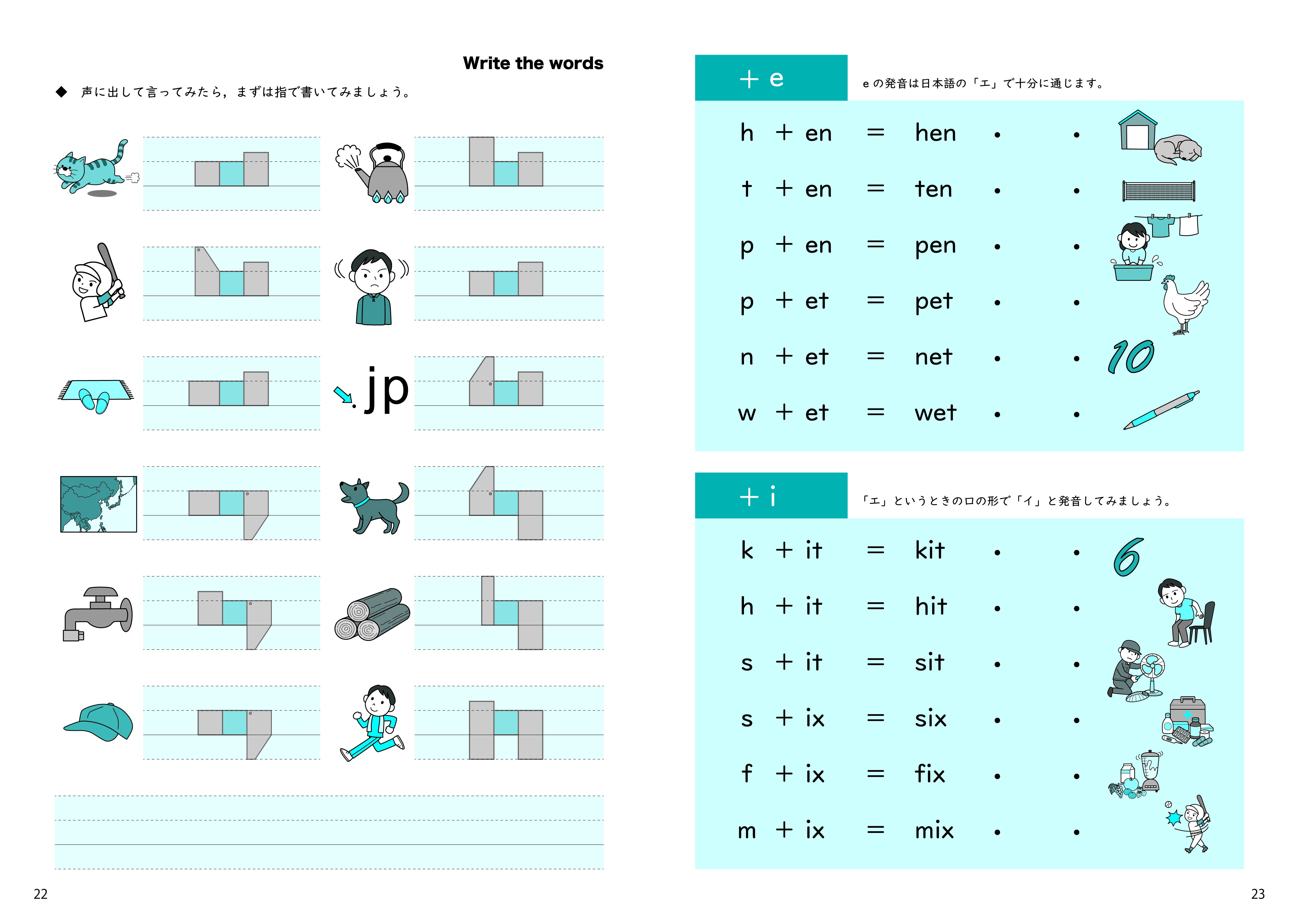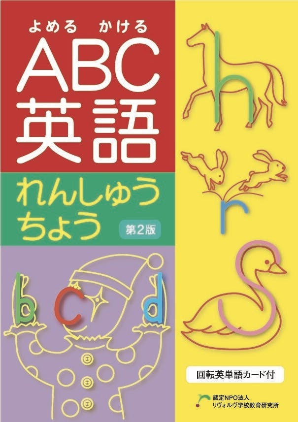 文字音で始まる単語を表した絵の中に、文字を組み込んでいます。hとn を混同する子には、「馬の首は長くね」とアドバイスします。小文字の練習ページでは、「c書いて、2階から縦ぼう d 」など、「耳からのヒント」も添えています。