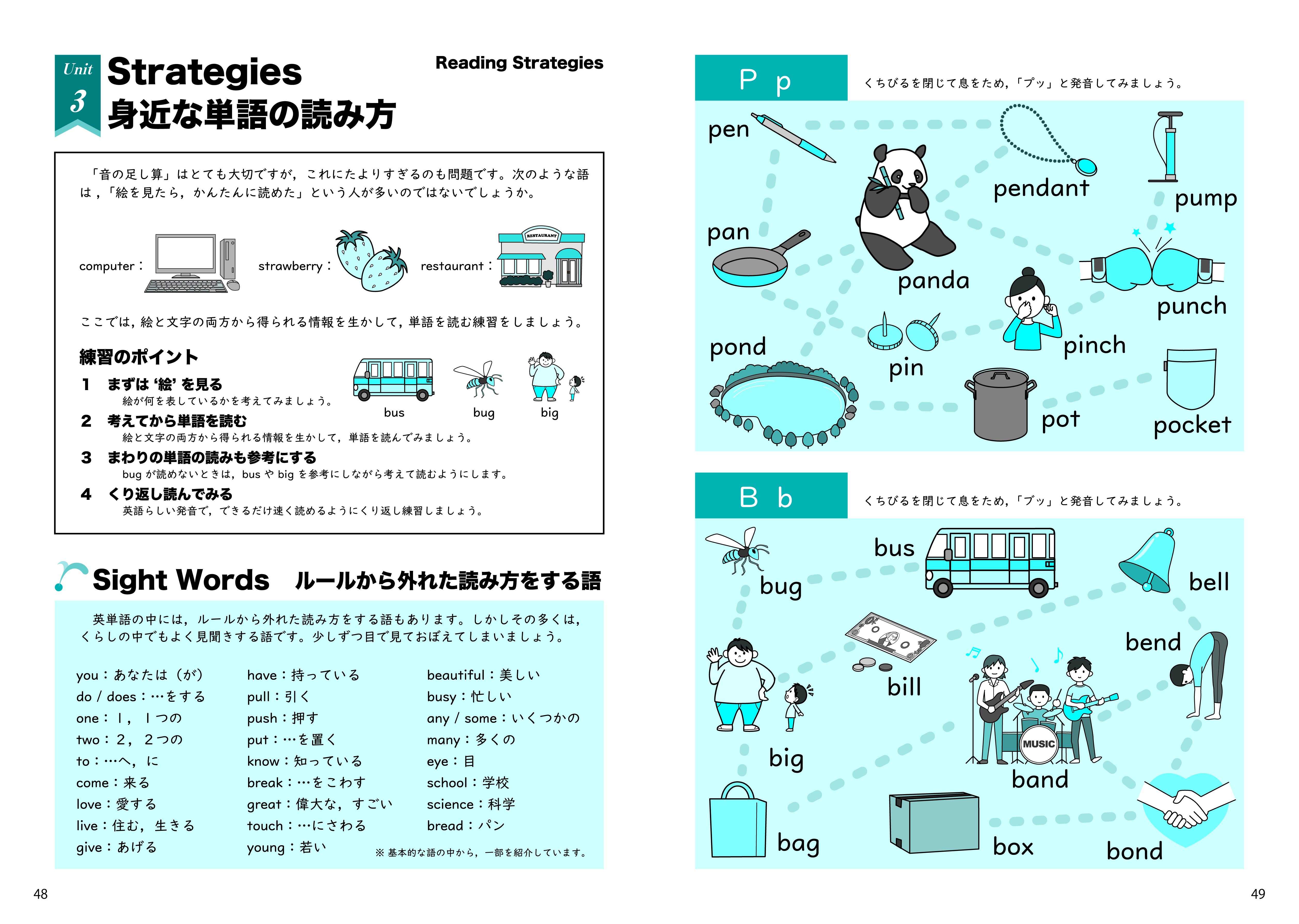 例えば band をもとに bond:きずな / bend:曲げる など語いを増やしていきます。