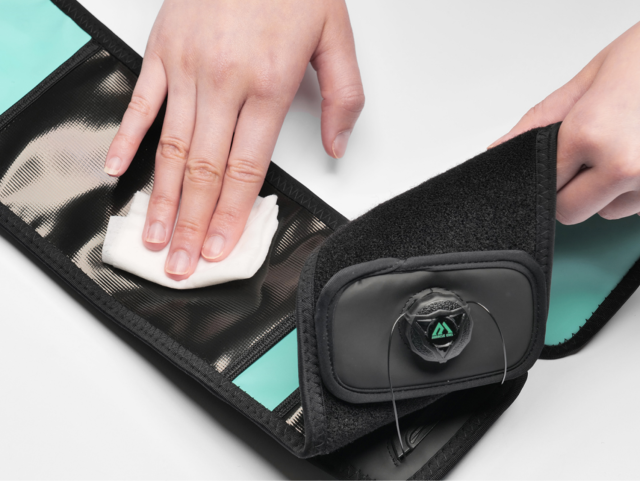 A:洗濯機で洗うことはお控えください。ぬるま湯で軽く手洗いをするかウェットティッシュで簡単に拭いて ください。漂白剤を使ったり、ドライクリーニングはしないようにご注意ください。乾燥の場合は日の当たらないところで自然乾燥してください。ベルトやパッドを絞ることはお控えください。