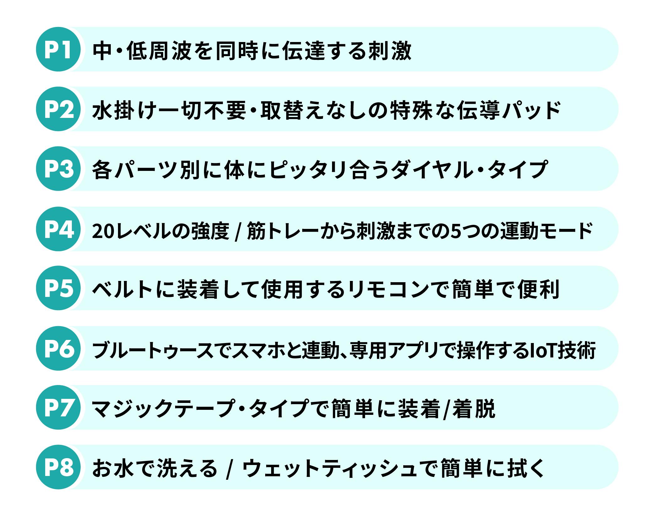 従来のフィットネスセンターでのみ活用していたEMS装備を無線化して家庭用に普及し、身体部位別製品を開発して高価なスーツに比べて低価格でEMS装備に対する進入障壁を低くしました。