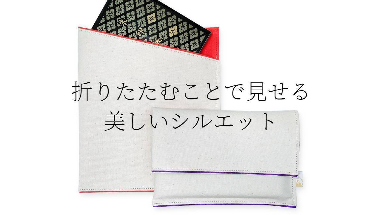 御朱印帳を入れて折りたたむと、少しだけ内面の染色された帆布生地が見えるようにデザインしています。見せすぎないシンプルなデザインですので、長くご使用いただけます。