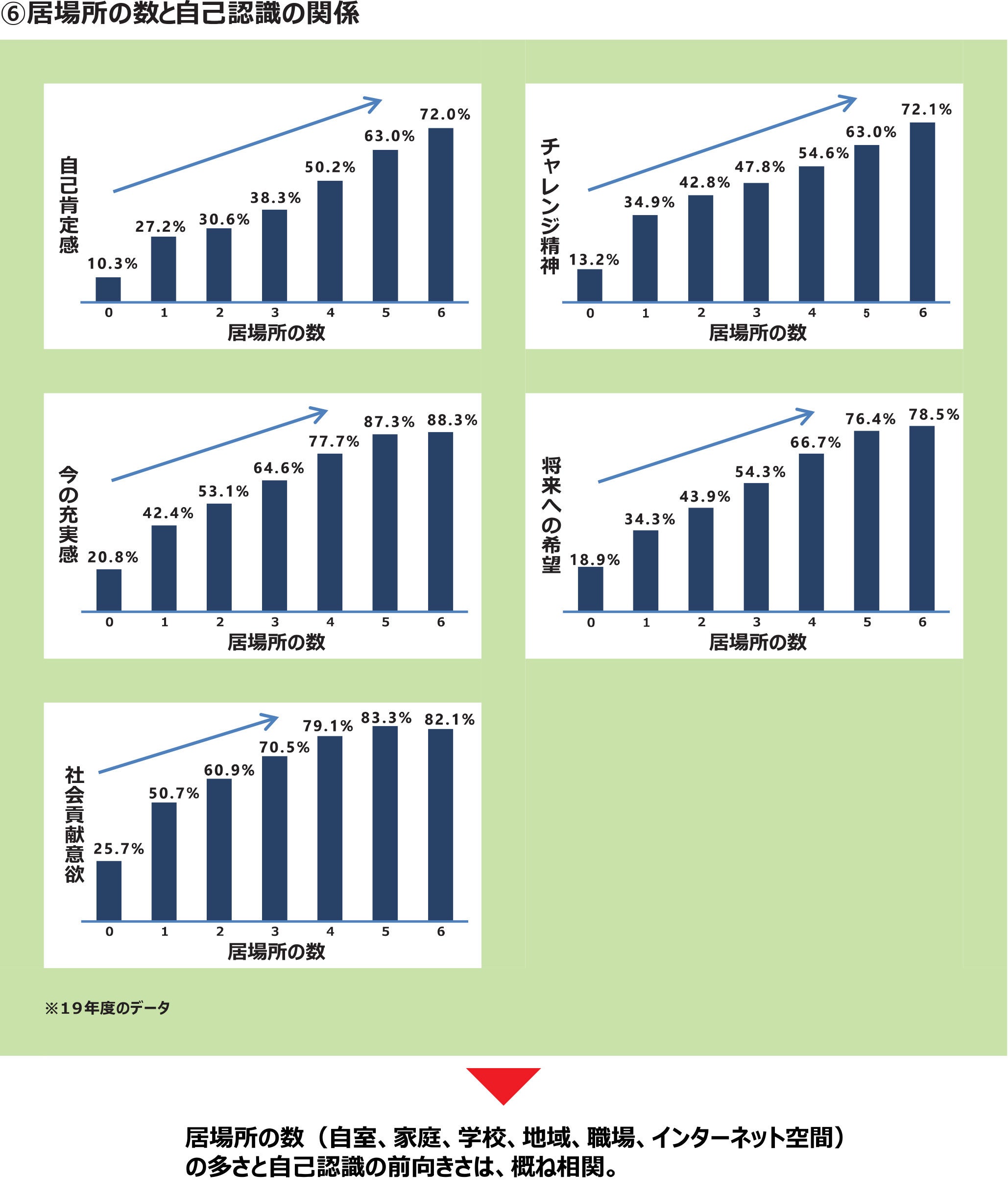 ●内閣府調査「子供・若者の意識に関する調査」の中では「居場所」について、【居場所(自室、家庭、学校、地域、職場、インターネット空間)】の多さと自己認識の前向きさは、概ね相関。とあります。