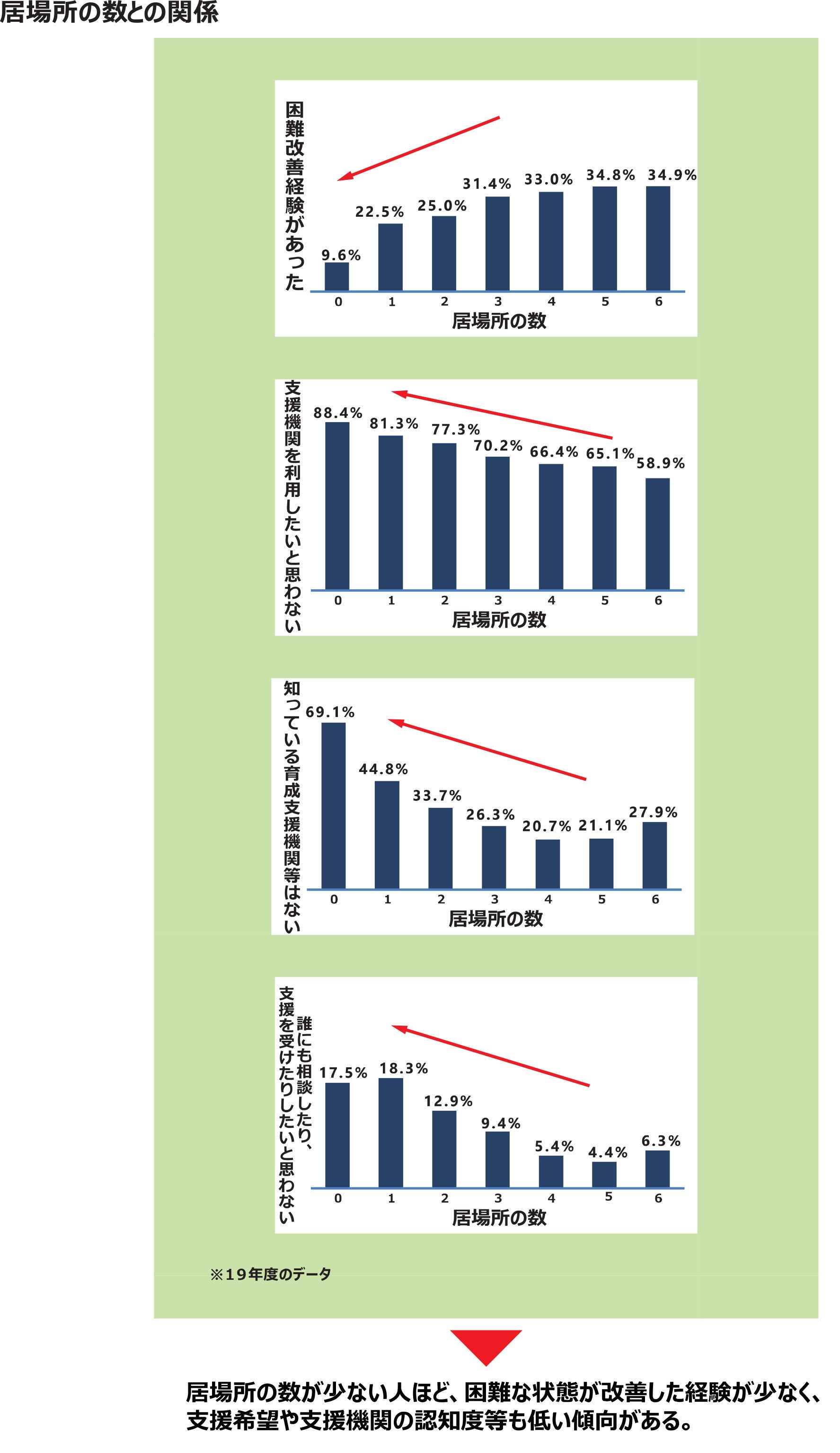 本文の中で、「居場所が少ない人ほど、困難な状態が改善した経験が少なく、支援希望や支援機関の認知度等も低い傾向がある。」となっています。