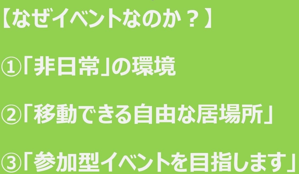 「居場所」というと、どうしても物理的な場所(不動産物件)をイメージします。固定的な場所が多いですが、今回の挑戦は「持ち運びできるコトを居場所」にするプロジェクトです。