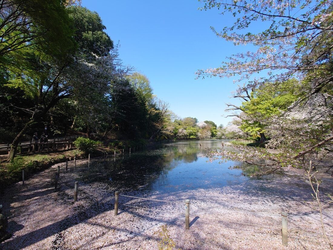 写真のとおり、散りゆく桜が非常にきれいです。天気予報は、11日(金)は雨、12日(土)は晴れ、13日(日)は雨とのことで、そろそろ2025年の桜ともお別れでしょうか。残り少ないお花見を、精一杯楽しんでみてはいかがでしょうか?