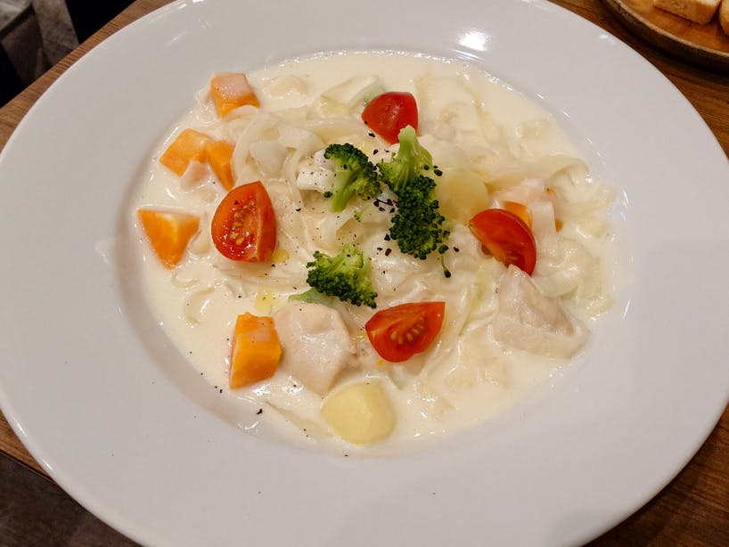 猫ちゃんの写真やグッズが、素敵に飾られた店内に入ると、店名の『Where is a dog?』の意味の一部がお分かりになるという、何とも素敵なインテリア。昨日の感動を胸に、今日はスタッフさんにもご紹介ということで、YouTube動画『吉祥寺さんぽ』の合間に、お昼ご飯を食べにやって参りました。昨日は、チキングリーンカレーにしましたので、わたしはパスタにしよう!と、クリームパスタを注文しました。