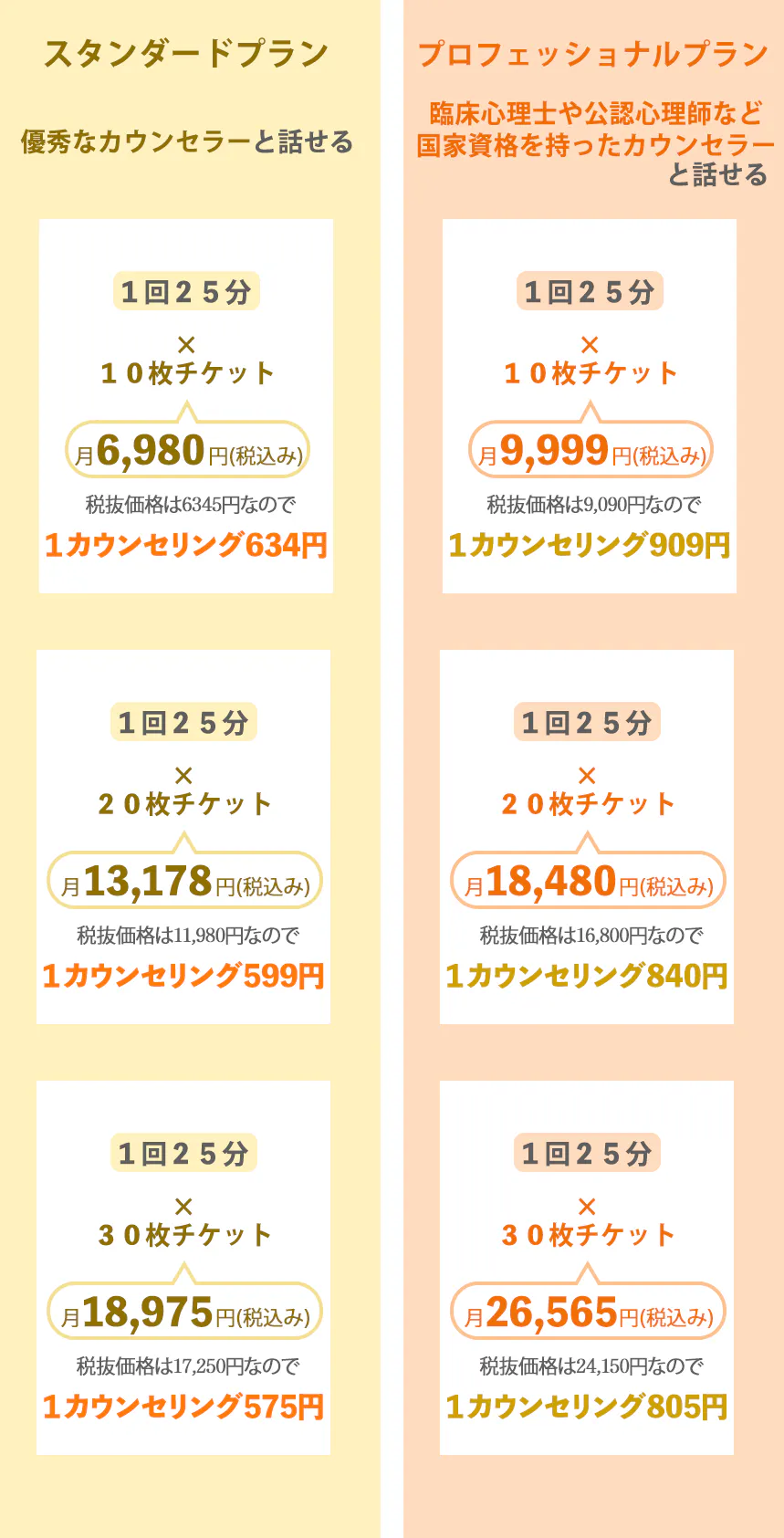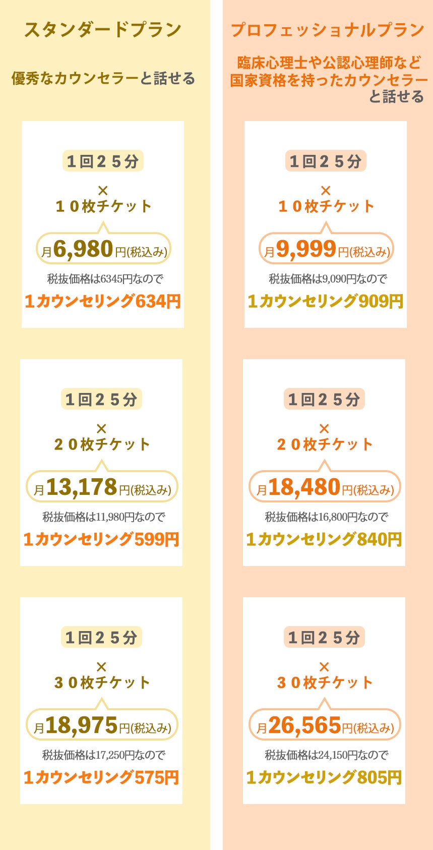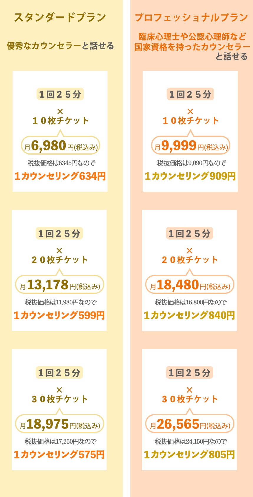 1回25分カウンセリングができるチケットを月に何枚買うかで値段が変わります。