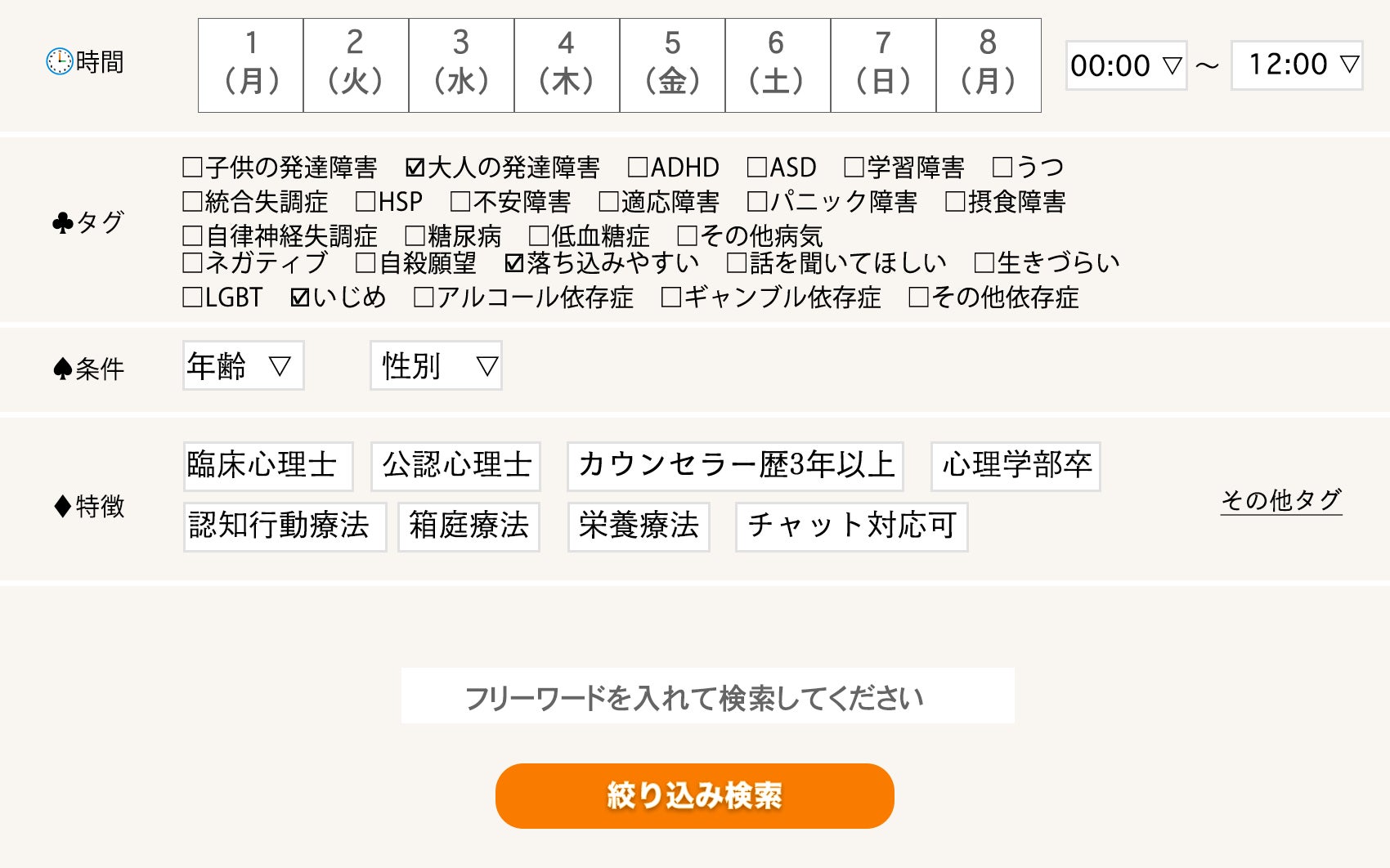 性別、年齢、カウンセラー歴や資格の有無は勿論のこと「発達障害」「鬱」「統合失調症」「HSP」「依存症」などタグ検索機能をつけることであなたが望むカウンセラーを見つけることができます。