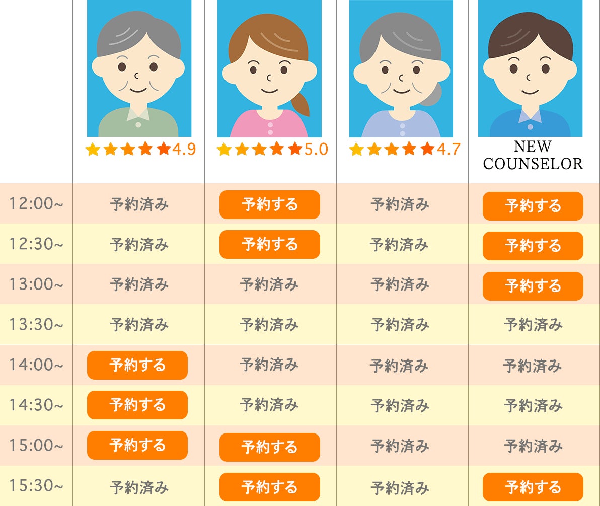 お気に入りのカウンセラーを見つけたら予約をしてください。