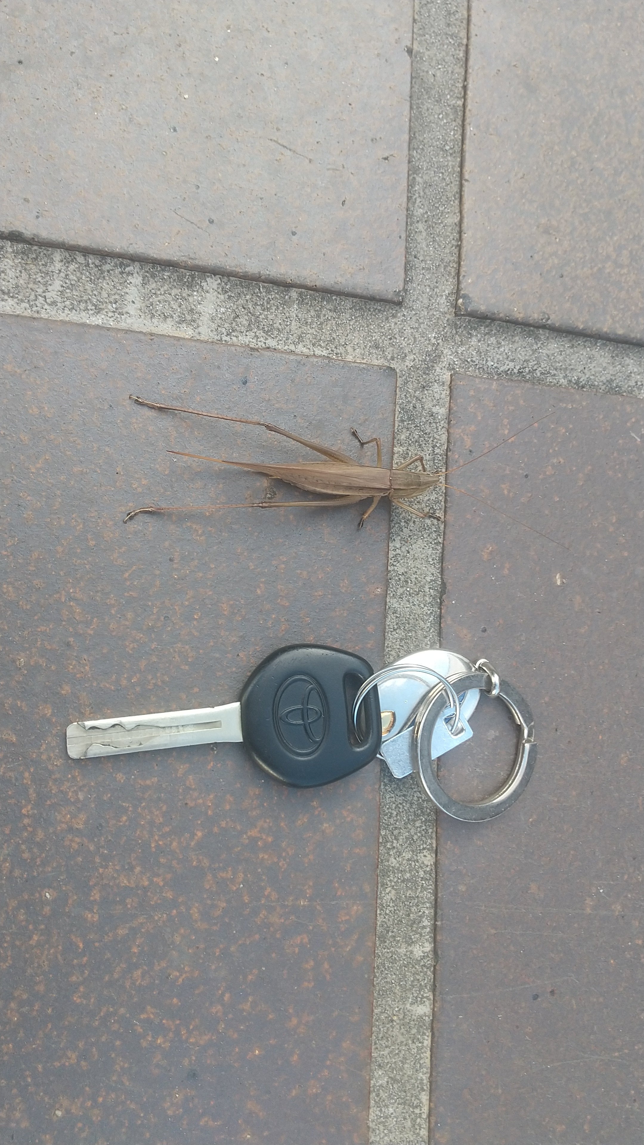 酒蔵の工場の前に大きなバッタがいました。車のカギのキーホルダー入れて同じくらいって久々の大物。間違ってタイル張りのところに迷い込んでいたので、すぐに草むらに放してあげました。