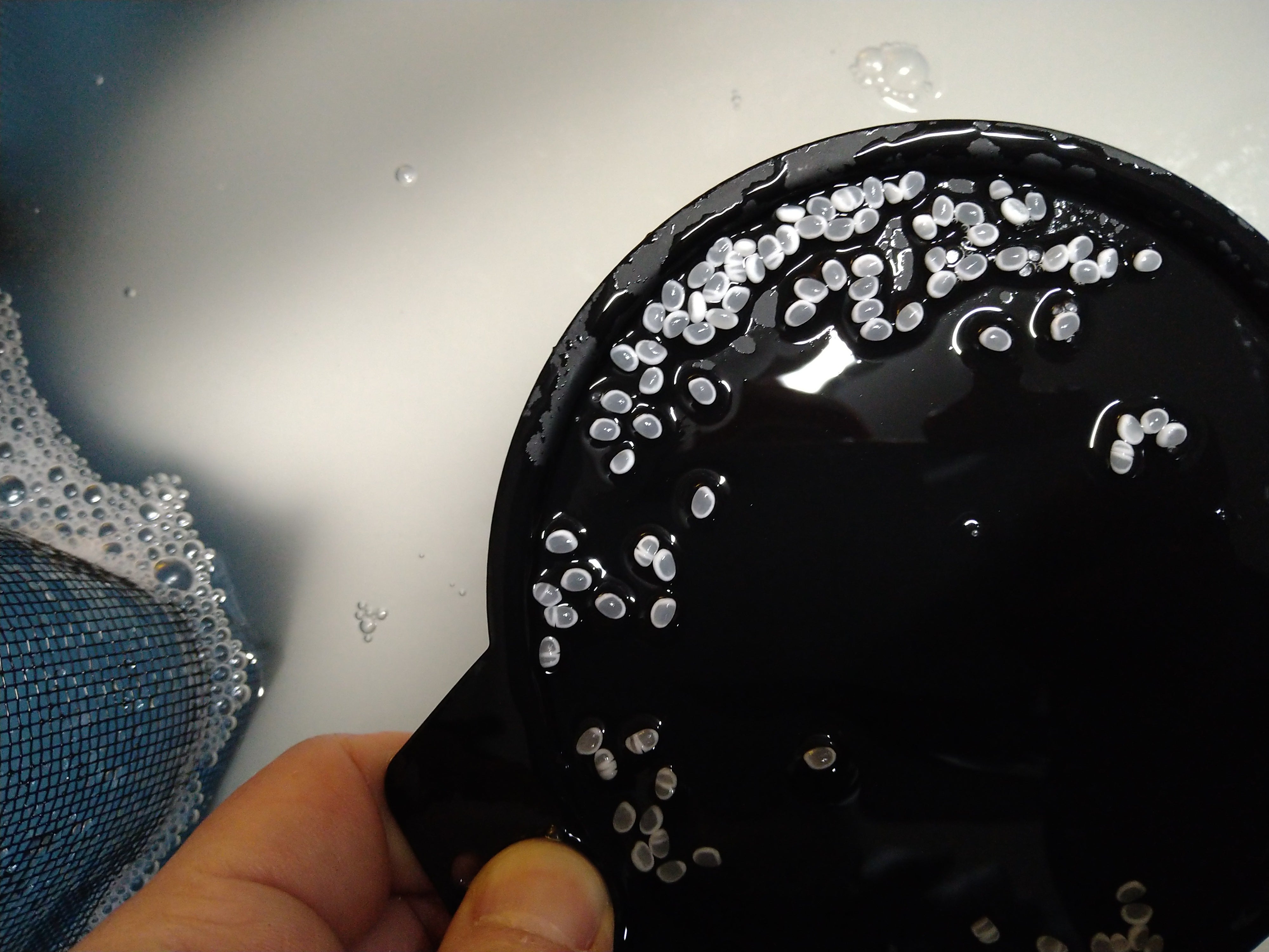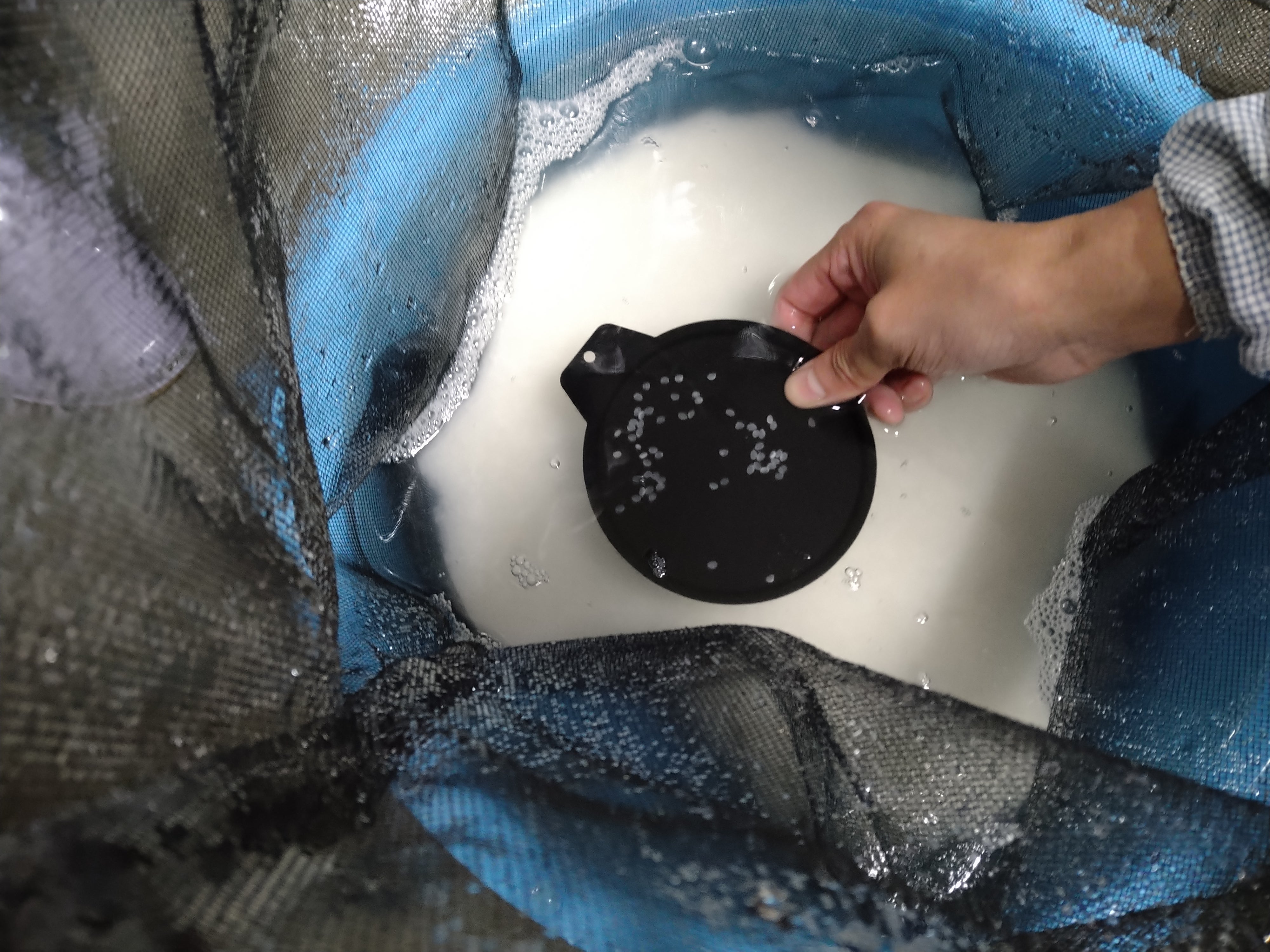 黒いお皿で浸水状況を目で確認し、時間を決め、次々と洗米、浸漬、水切り、計量と行っていました。