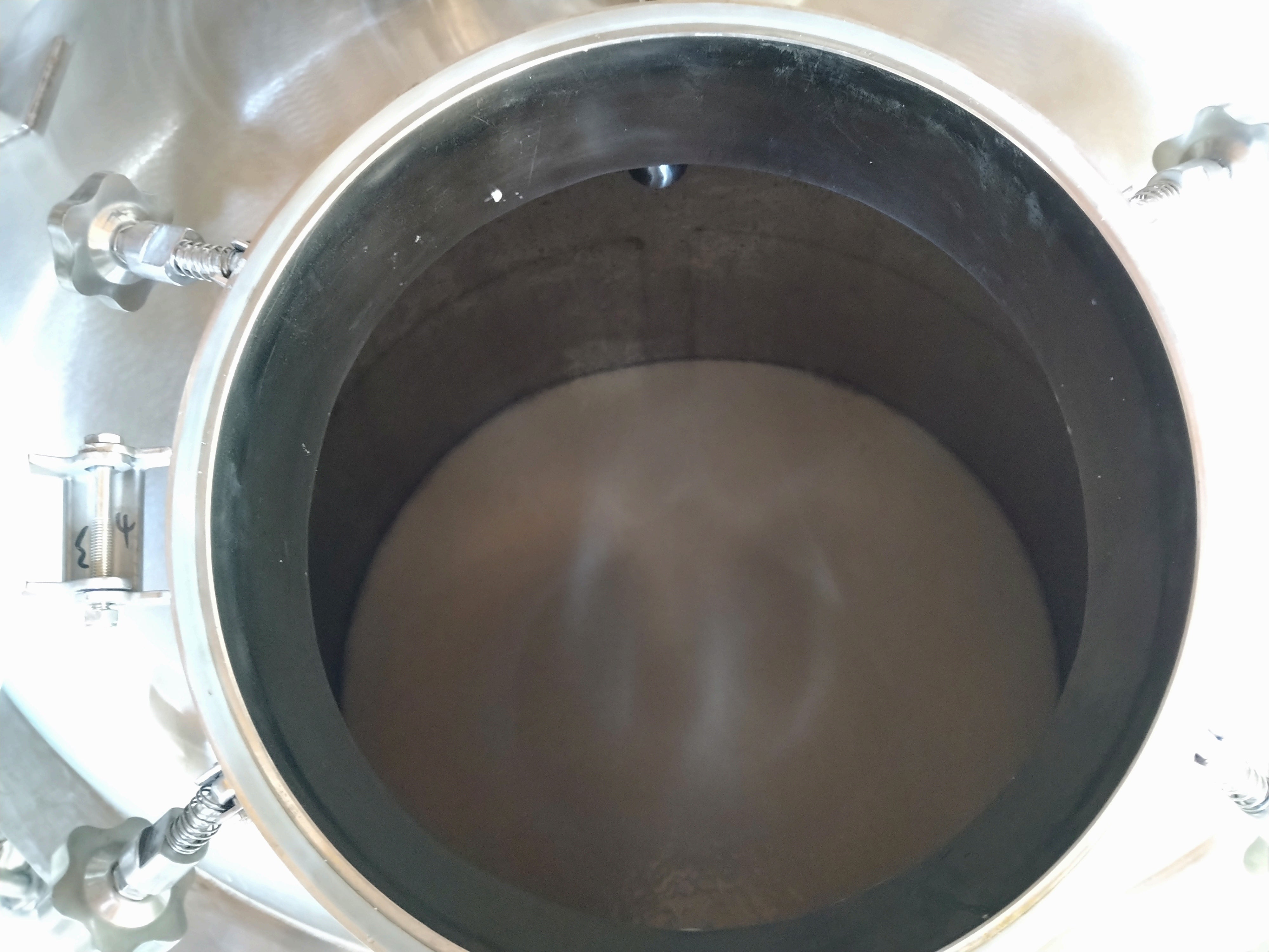 こんな感じです。全体の1/2くらいまでしか入っておりません。泡が上がってくるだろうと思い、また、初めての醸造なので総米420kgを使用した小さい仕込です。