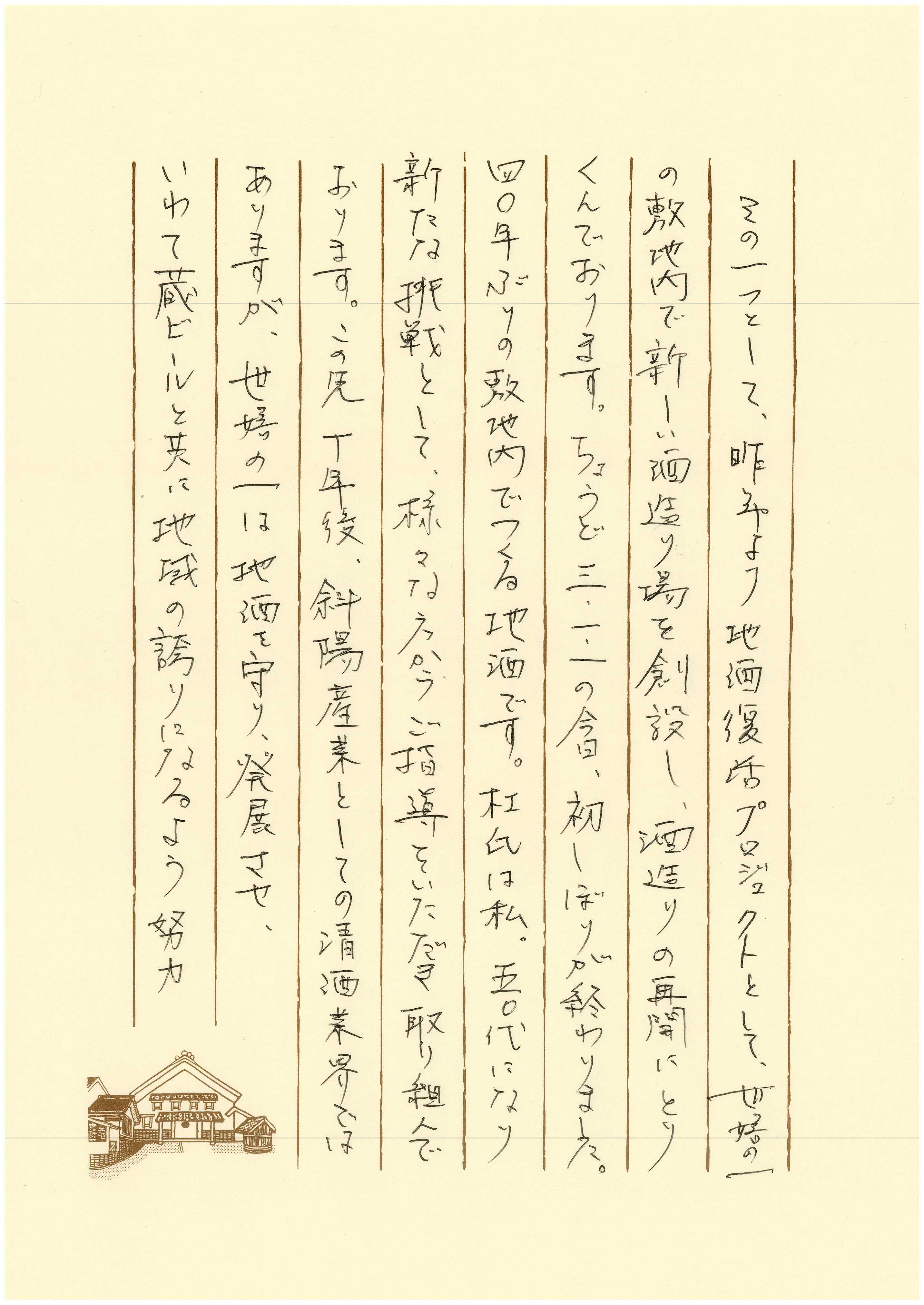 震災当時30代後半だった私も50代になり、世の中への視点も少し広がりました。地域、スタッフ、家族がより良くなるために、地方零細企業の経営者として、挑戦し続けていかなければいけないと思います。 その1つとして、今年は地酒復活プロジェクトとして、世嬉の一の敷地内での酒造りの再開に取り組みました。