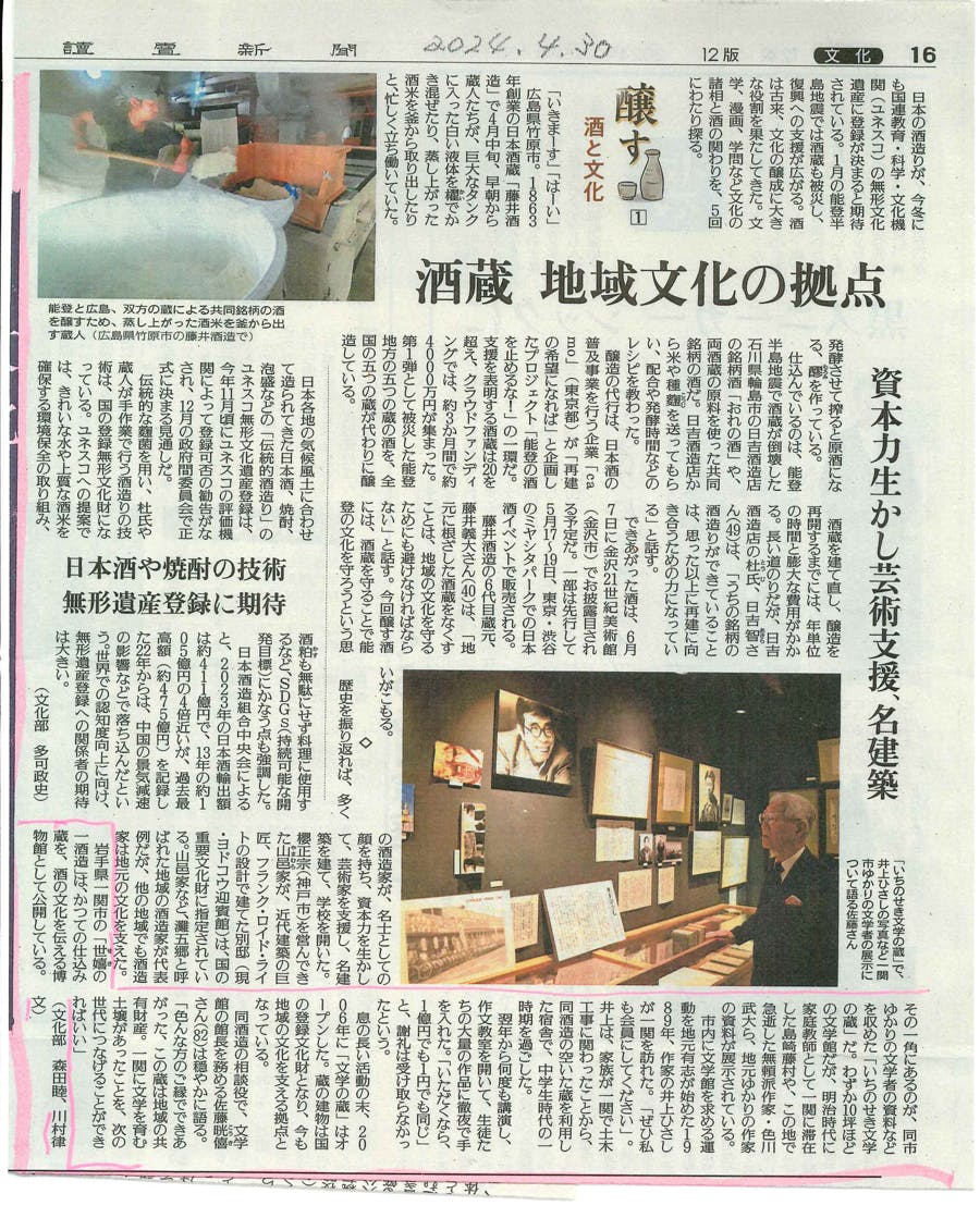 記事には日本酒が世界無形文化遺産に登録に向けての事や能登震災で援助しあう酒蔵を記載していますが、その下に、文学の蔵も記載されています。
