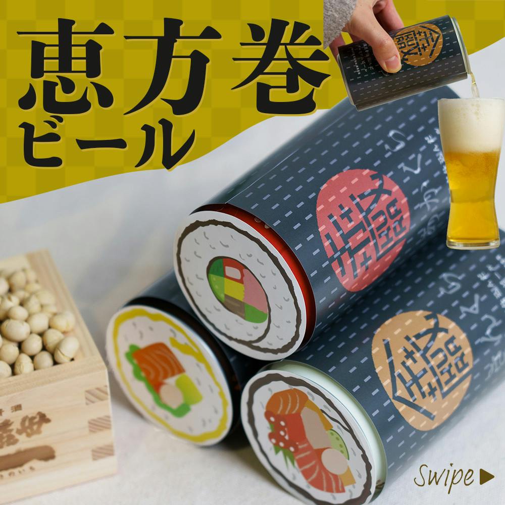 さて、今年も恵方巻ビールを発売いたします。コロナ禍に考えた商品ですが、世の中が少しでも明るくなればということと、恵方巻の廃棄問題もあり、缶ビールにシールだと期日過ぎても捨てなくて済むので、いろいろな意味で開発した商品です。