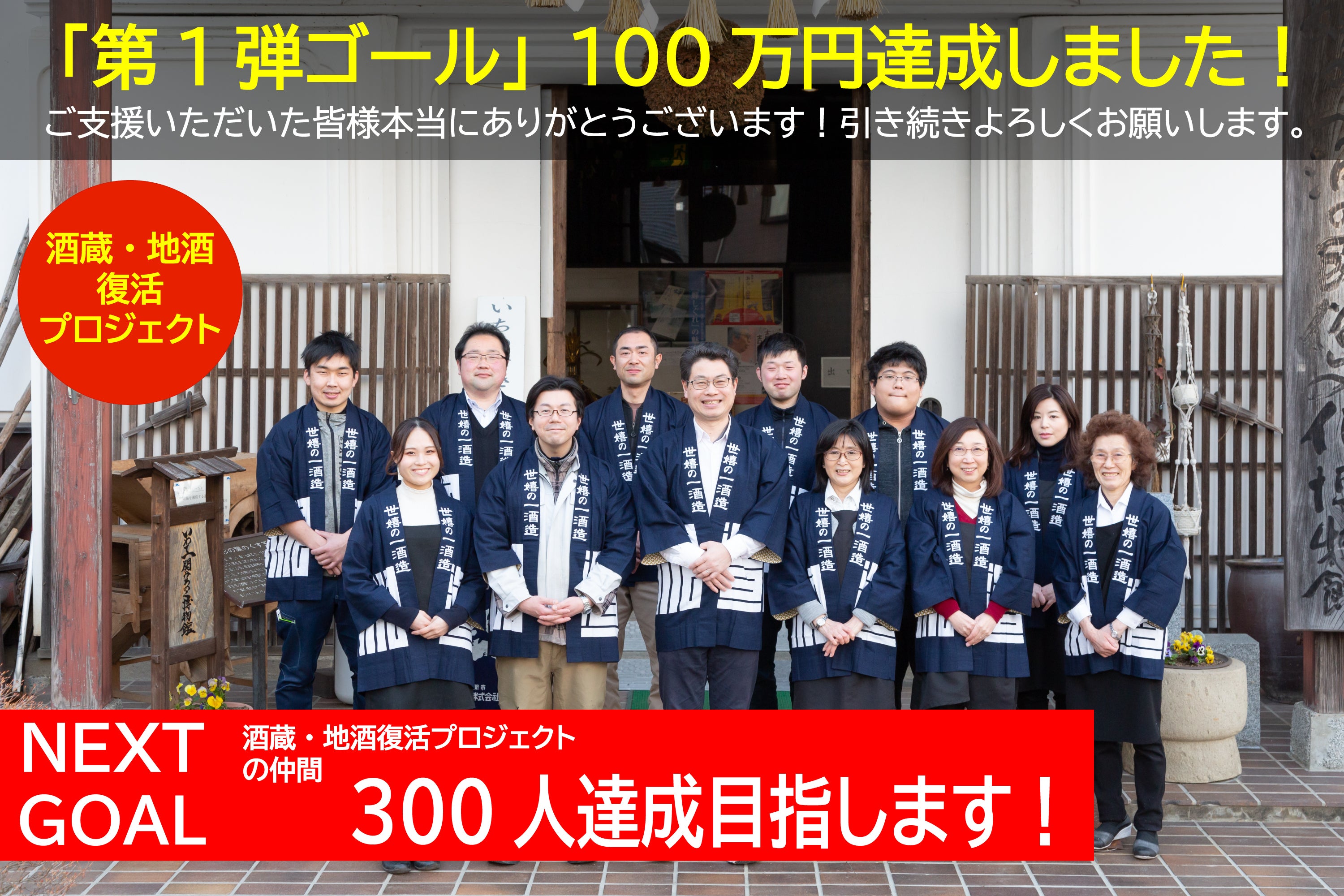 御礼が遅くなりました。本当に申し訳ございません。まさかスタート初日で達成するとは思いませんでした。本当に皆様ありがとうございます。おかげさまで、第1弾の目標であった、クラウドファンド100万円達成しました。通常こういう場合、NEXTGOALを決めるのですが・・・・私達がこのクラウドファンドを行った目的が、クラウドファンドを通じてお客様とのつながりを作り、地酒復活を並走していただける仲間を募集するため始めました。世嬉の一は14名の小さい会社です。14名が郷土料理レストランの担当であったり、ビール醸造やジン、コーラの担当であったり、発送の担当であったりします。営業担当がいない会社です。人と人のつながりで、お客様と進んできた会社です。酒蔵復活も、これから清酒世嬉の一を通じて、田舎から多くの仲間と繋がり、進んでいきたいと考えています。世嬉の一の社名の由来は、「世の人々が嬉しくなる一番の酒造りを目指す」です。ここから経営理念、『「幸せの創造」~私達は仕事を通じて、お客様の笑顔を創り、その輪を少しづつ大きくしていきます。~』とスタッフと共に決定しています。今回のクラウドファンドを行ったのもこの経営理念を実施するためになっています。クラウドファンドを通じて、お客様と共に、酒蔵復活・地酒復活を達成し、その後もお付き合していただきたい仲間を集めたいと思っています。なので・・・ネクストゴールは、300人の仲間をつくるという目標にしました。私達と共に蔵元復活、地酒復活プロジェクトを並走してくれる仲間を・・・そして、ファンドが終わってもつながり続ける仲間を作りたいと思います。あと、50日程度時間があります。最後まできっちり走り切りたいと思います。すでにご支援いただいたお客様、本当にありがとうございます。そしてこれから仲間に参画したいというお客様、ぜひ、今後ともよろしくお願いします。