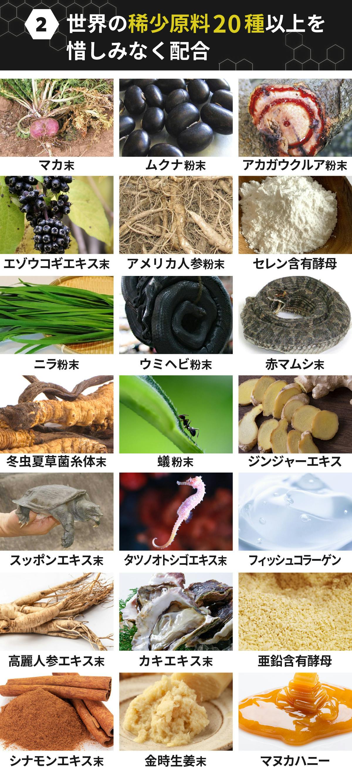 プルーンエキス(アメリカ製造)、精製はちみつ、果糖ぶどう糖液糖、マヌカはちみつ、金時ショウガ末、亜鉛含有酵母、コーンスターチ、カキエキス末、シナモンエキス末、高麗人参エキス末、マカ末、ムクナ末、アカガウクルア末、エゾウコギエキス末、アメリカ人参末、セレン含有酵母、韮種末、蟻末、スッポンエキス末、ウミヘビ末、赤マムシ末、冬虫夏草菌糸体末、タツノオトシゴエキス末(フィッシュコラーゲン、タツノオトシゴエキス)(ゼラチンを含む)、ジンジャーエキス末、マカエキス末/カフェイン、香料、増粘剤(キサンタンガム)、カラメル色素、ビタミンB6、ビタミンB1、ビタミンB2、香辛料