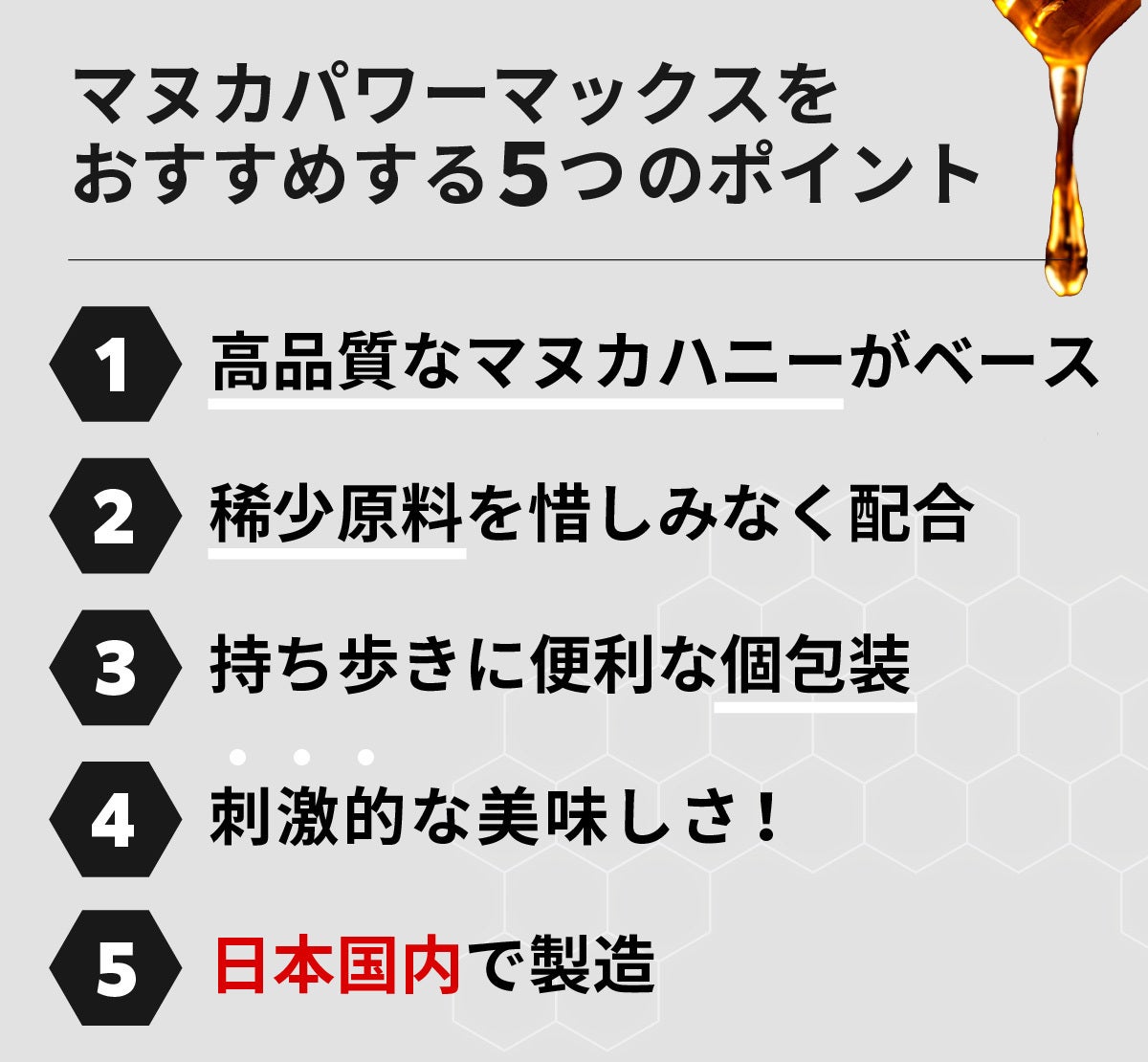 長い研究・調査・企画・交渉を経て、ようやく完成にこぎつけました。それが「マヌカパワーマックス」です!ぜひ皆様のパワフルな毎日をサポートさせてください!