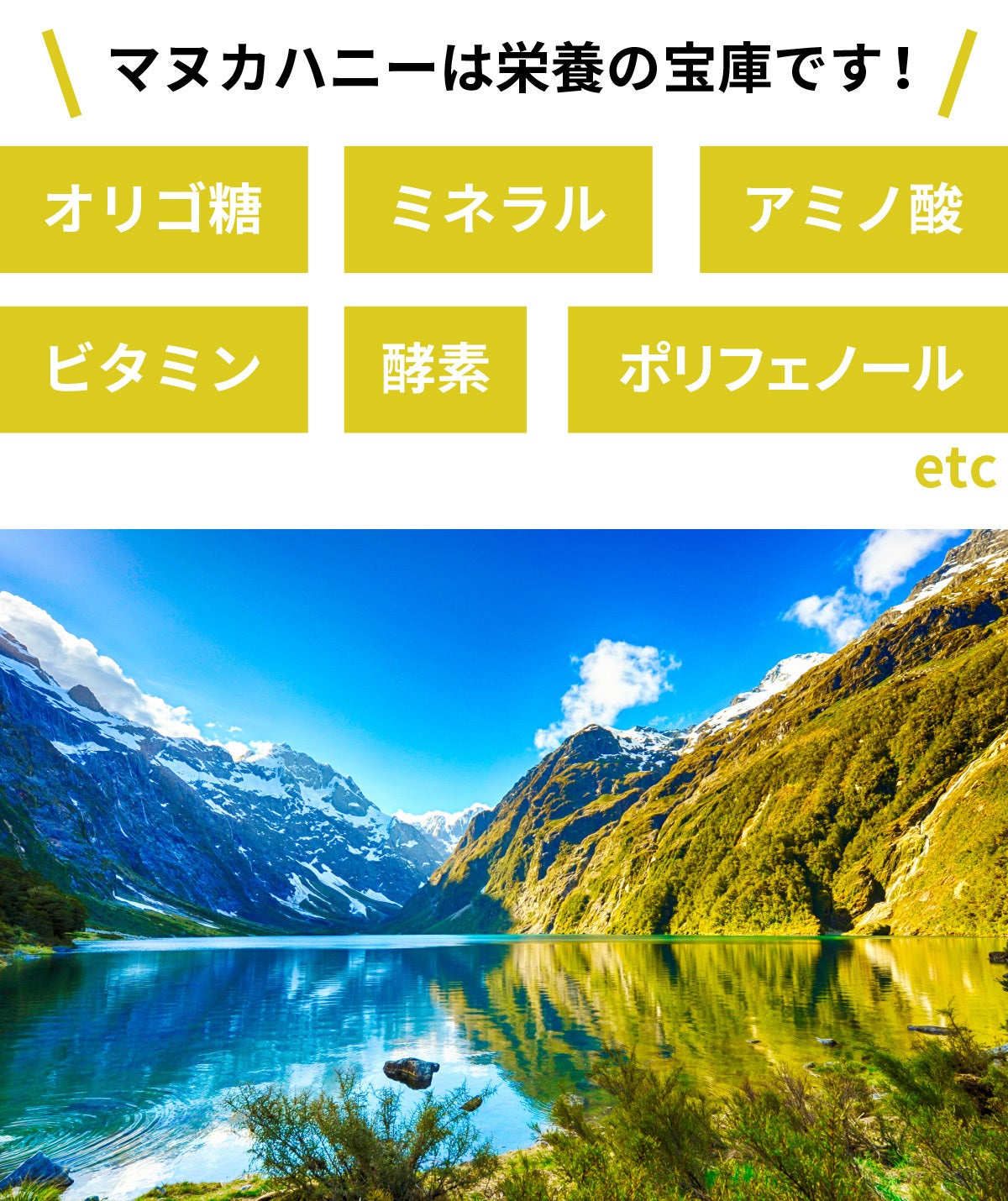マヌカハニーはニュージーランドだけに自生する「マヌカ」という樹木の花から採れる非常に貴重な蜂蜜です。マヌカハニーは約190種類もの栄養素を含む完全栄養食といわれ、美容や健康維持に大変人気です!