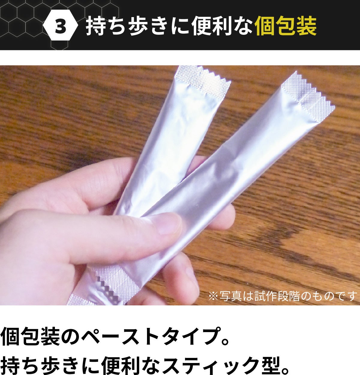 出張やジムなど、持ち歩きにも便利なスティック型です。個包装を開けて、手や食器を汚さずそのままお召し上がりいただけます。