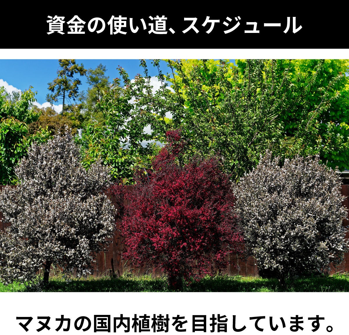 CAMPFIRE手数料に使用する他に、量産化して販売価格を抑え、誰でも気軽に健康を維持できるようにする予定です。いずれはマヌカの樹木を日本国内に植樹し国内マヌカハニーを生産できるようにしたいです。