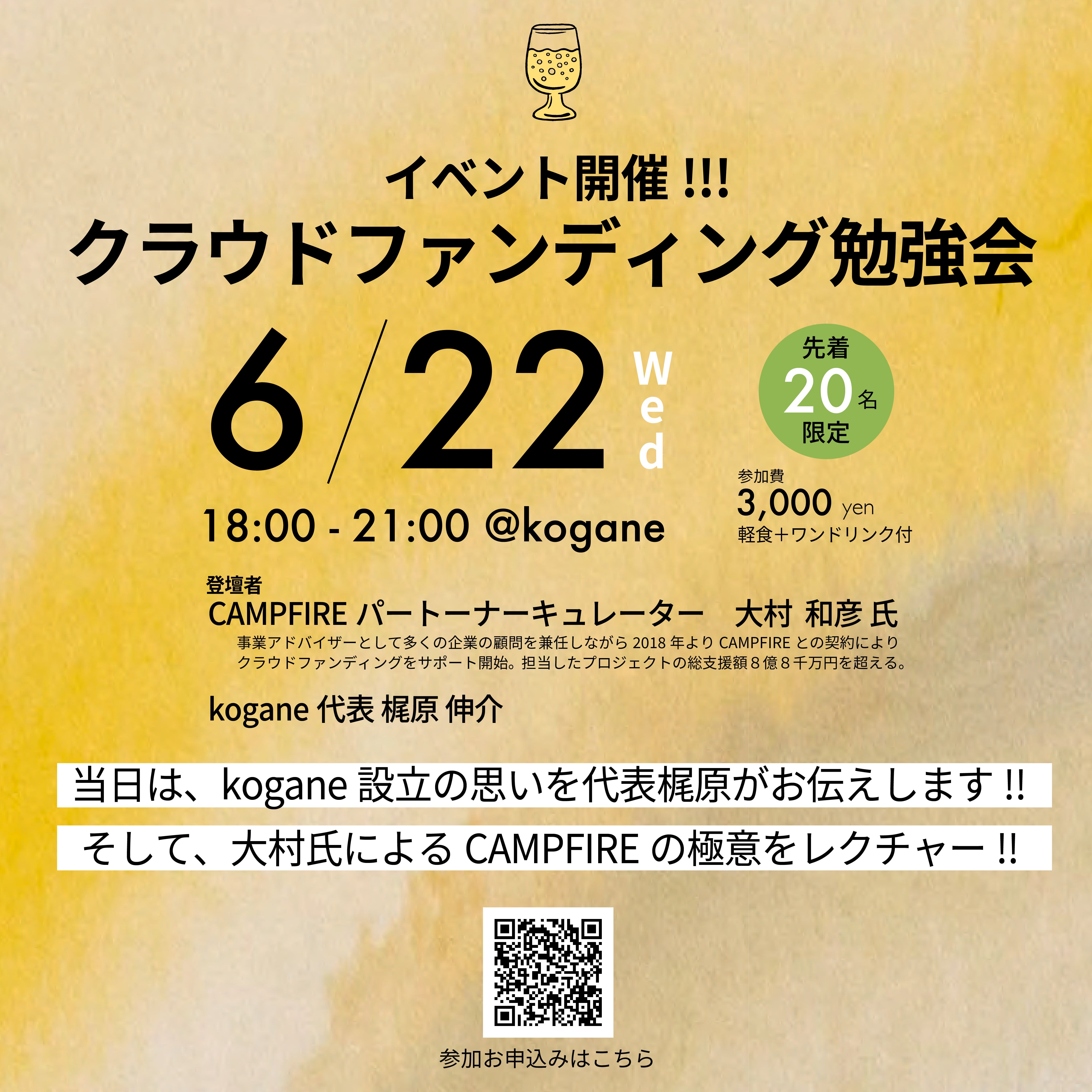 明日、6月22日(水)18:00~21:00『クラウドファンディング勉強会』がKOGANEにて開催されます!講師には、KOGANEのプロジェクトにもサポートして頂いてます大村氏をお迎えします。大村氏は事業アドバイザーとして多くの企業の顧問を兼任しながら、2018年よりCAMPFIREとの契約によりクラウドファンディングをサポート開始されています。担当したプロジェクトの総支援額は8億8千万円を超えておられます。まだお席に空きがありますので、・クラウドファンディングへチャレンジを考えておられる方・新しく何かを始めたい方・勉強してみたい方・資金調達を考えられてる方がおられましたら、是非お誘いお願いします。当日にはKOGANE代表の梶原から、世界一おもろい大手前通りにするための熱い話も聞けます!勉強会の参加申込はコチラからhttps://forms.gle/9LGd4avbcrk3MEKq6