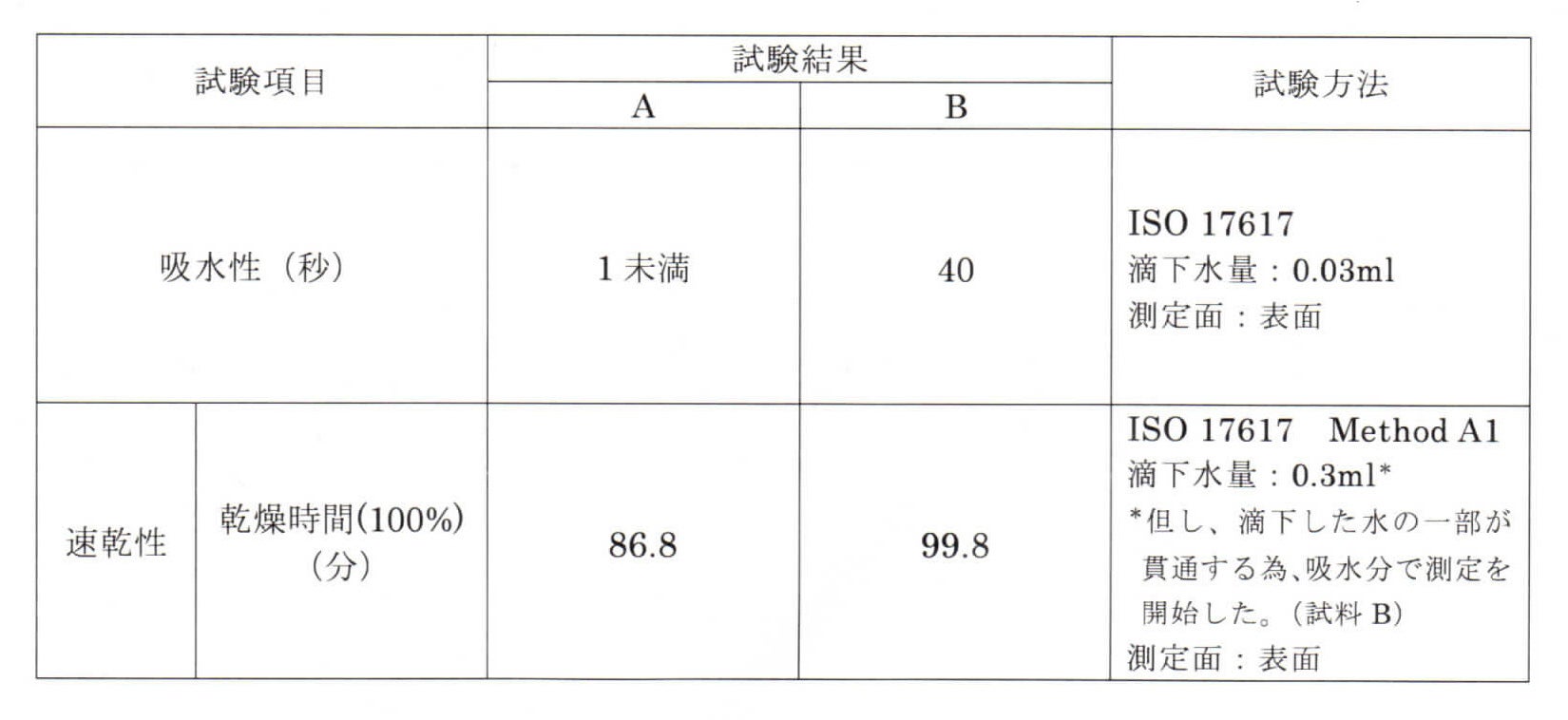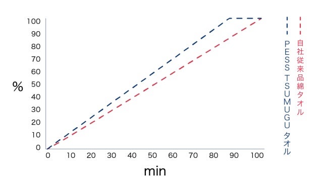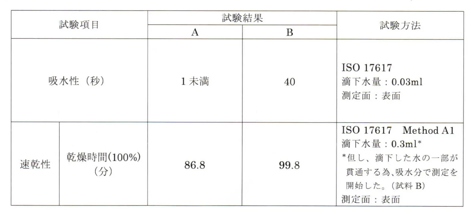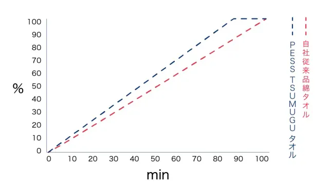 国内検査機関にて、吸水性・速乾性の試験を実施。自社従来品綿タオルとの比較において高い吸水性、速乾性を実証しています。