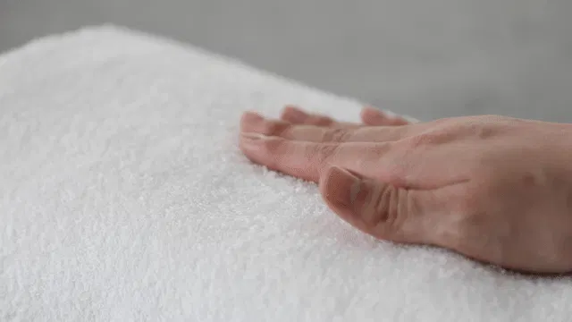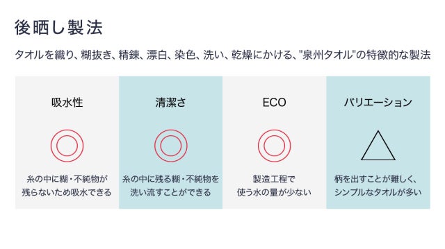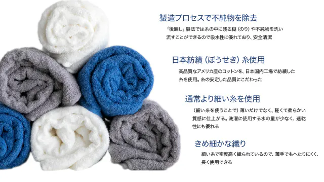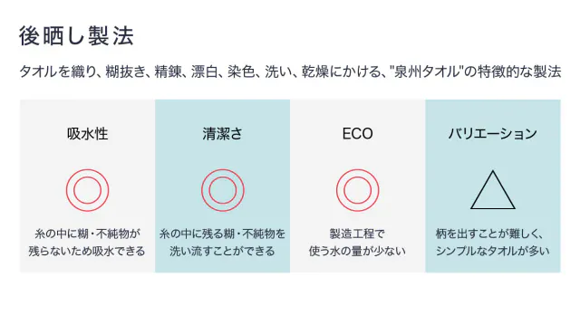 その秘密は、日本の泉州地域で作られるタオルの特徴的な製法、「後晒し」にあります。糸に付着した不純物や、タオルを織る際に糸につけた糊を綺麗に取り除くので、「吸水力」が高く、とても清潔感があります。