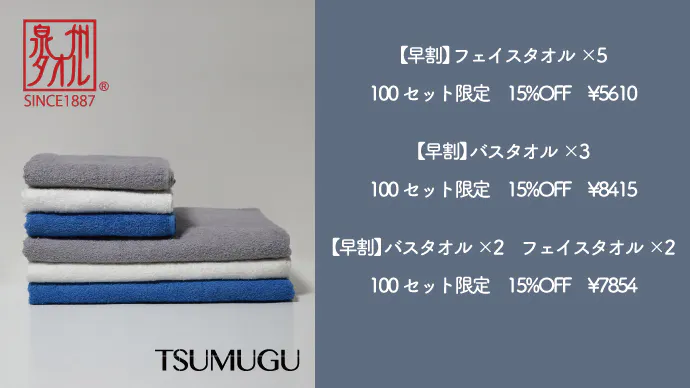 国内のタオル産業は安価な輸入タオルに対抗すべく、高付加価値・高品質タオルによるブランド戦略を推し進め、産地ブランドが国内で評価されるようになっています。今回はその中の大阪、泉州タオルの製造業者との御縁でTSUMUGUタオルの商品化が実現しました。