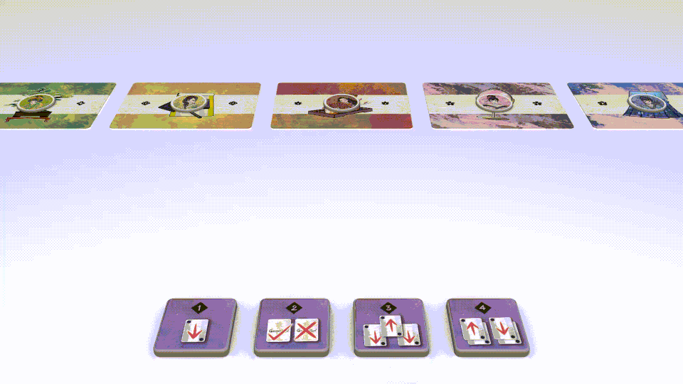 • 相手はその道具カードの中から 1 枚選んで芸者タイルの手前に置き、対応する芸者を移動させます。 • 残った 2 枚のカードは手番プレイヤーが芸者タイルの手前に置き、 任意の順序で対応する芸者を移動させます。
